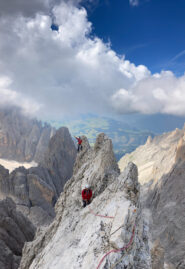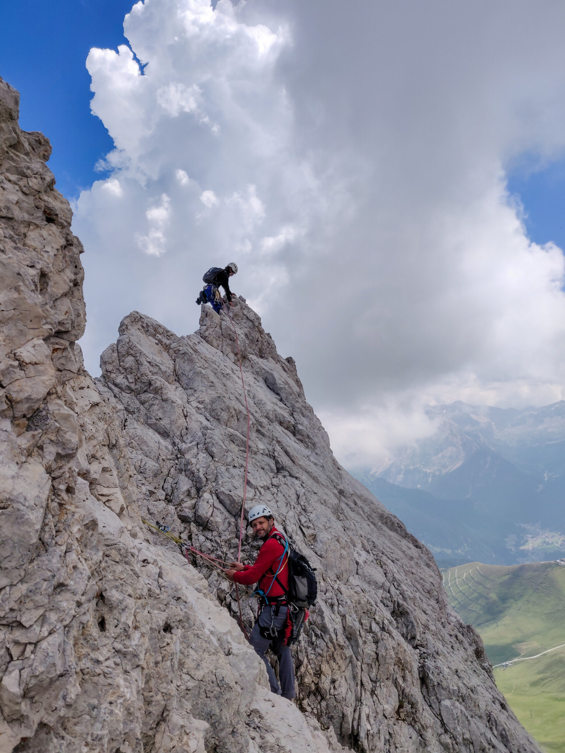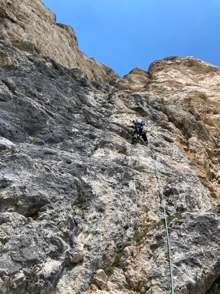 Via piacevole, linea chiara (non ci si puo perdere si è quasi sempre sul filo di cresta) roccia super, occhio al tiro di trsferimento molto…