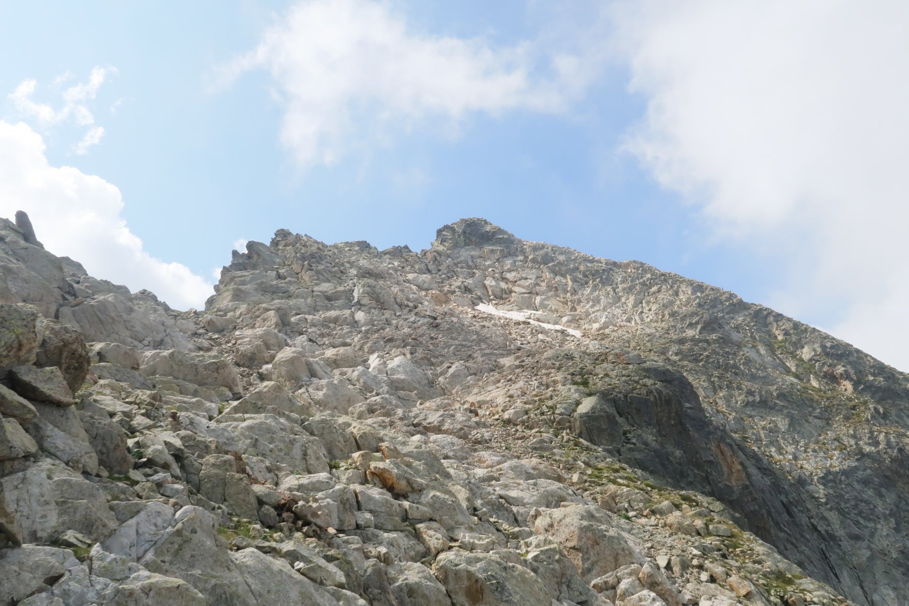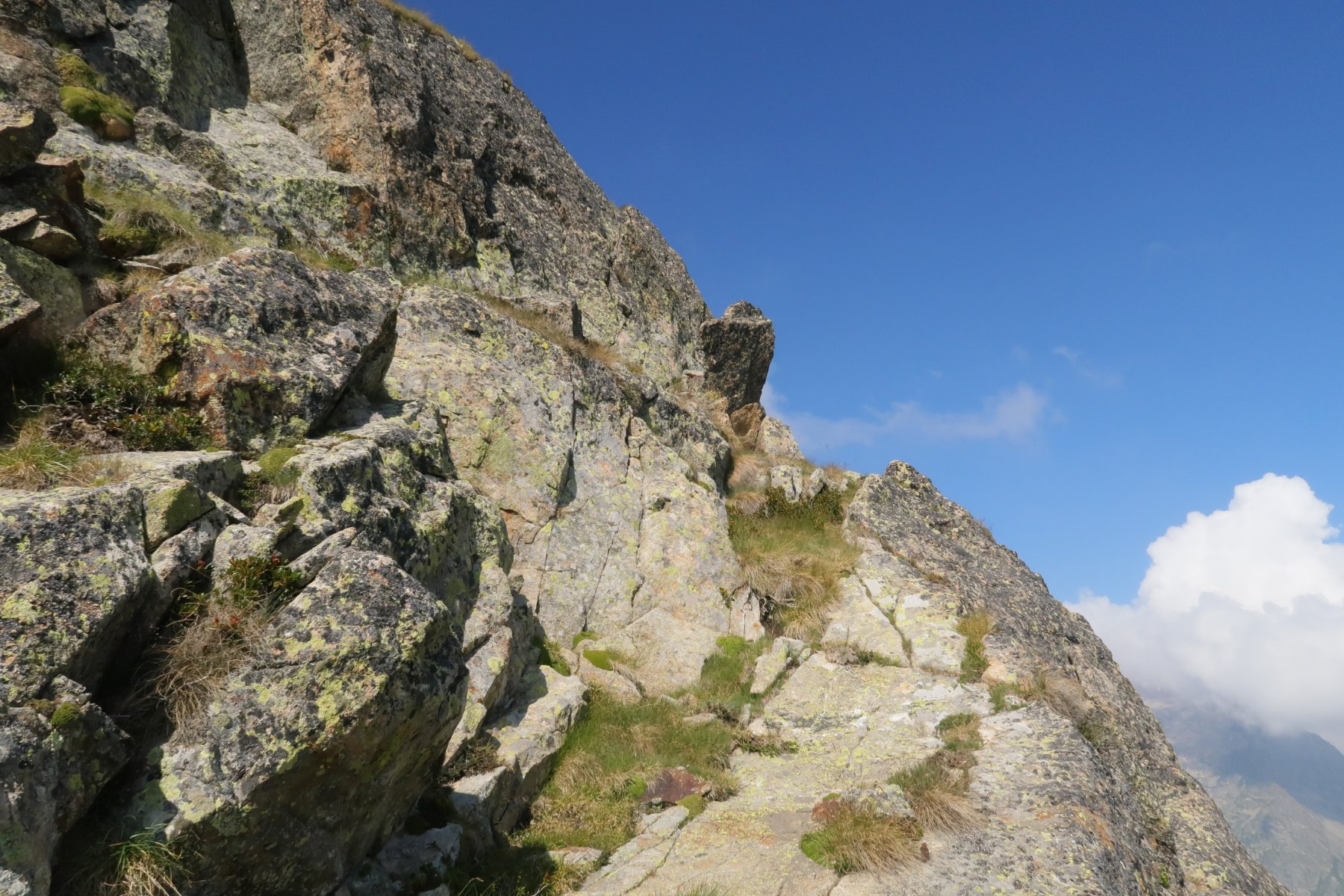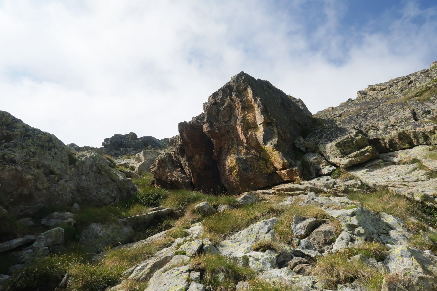 | lorry62 | Il gobbone di roccia nera e arancione che è il primo punto di riferimento. Raggiungere la base erbosa poi salirci sopra da sinistra | lorry62 | La cima della cengia ascendente che porta in cresta, con la caratteristica roccetta che si staglia nel cielo | lorry62 | Sfasciumi da attraversare per raggiungere il Roc. Salire al centro del pendio poi andare a una delle due creste, a dx (facili sfasciumi) o a sx (cresta PD, si attacca all'intaglio sotto le rocce nerastre) | lorry62 | Cresta di discesa | lorry62 | Ultimo tratto di discesa, finalmente segnato in modo evidente