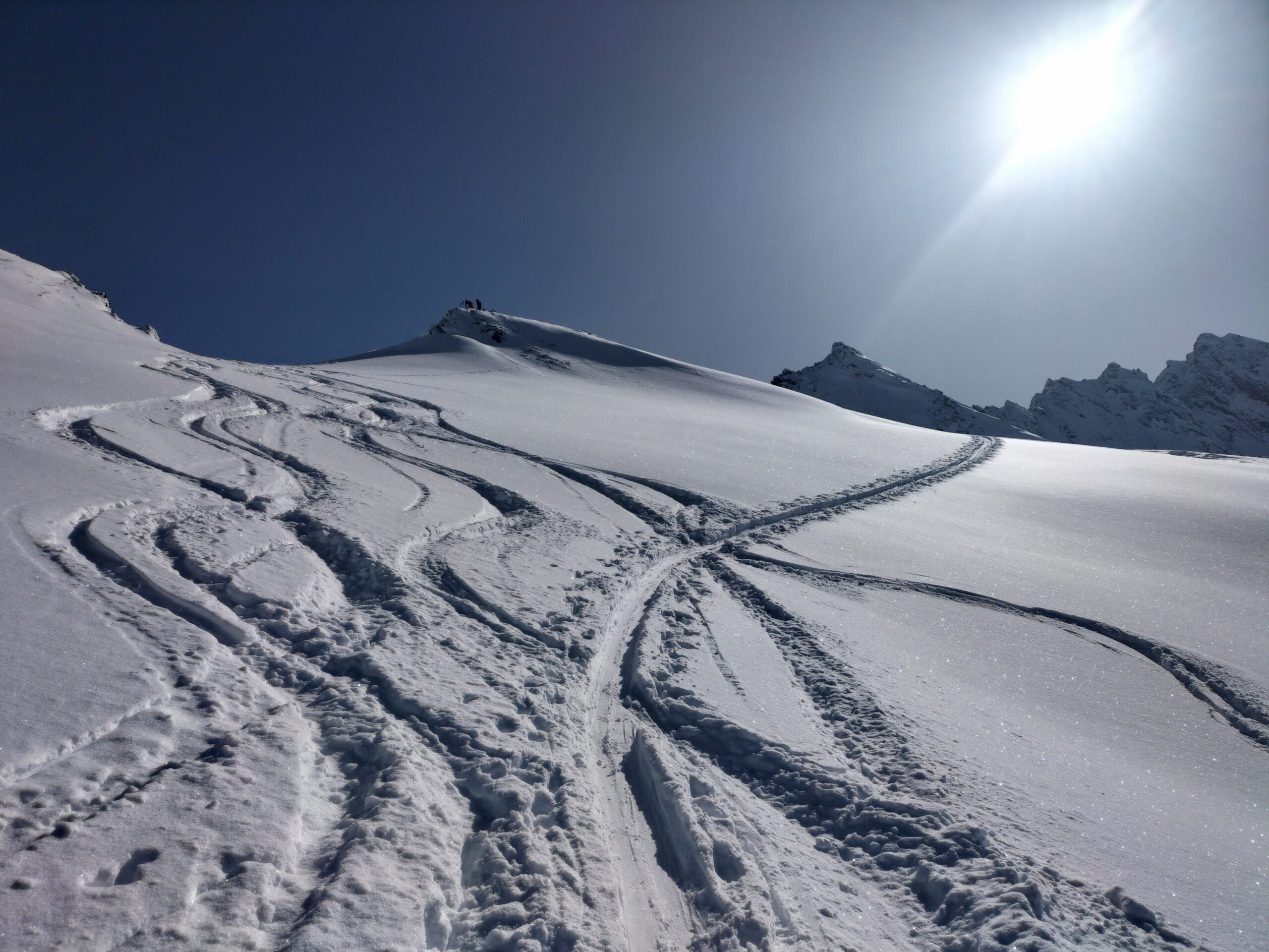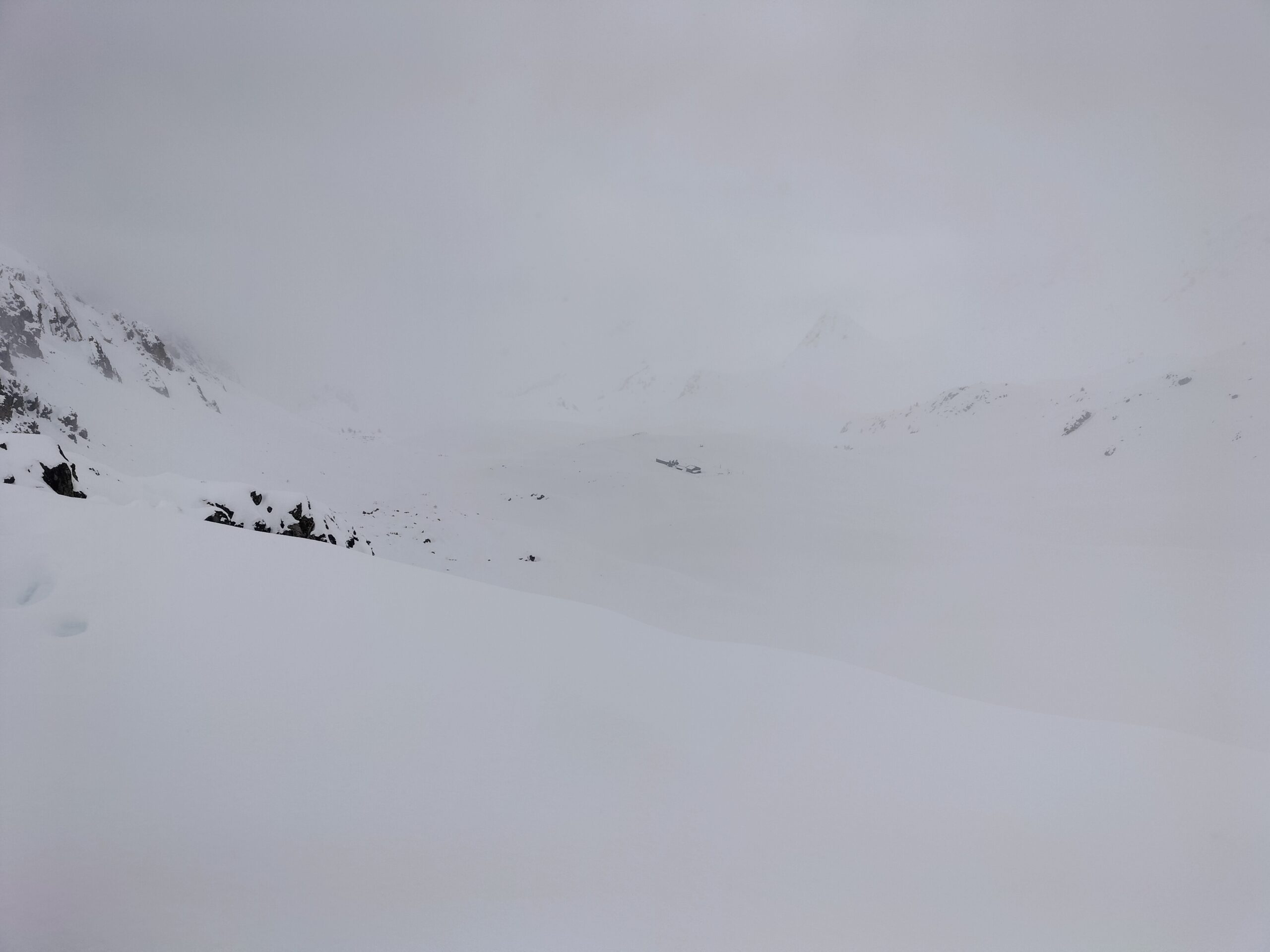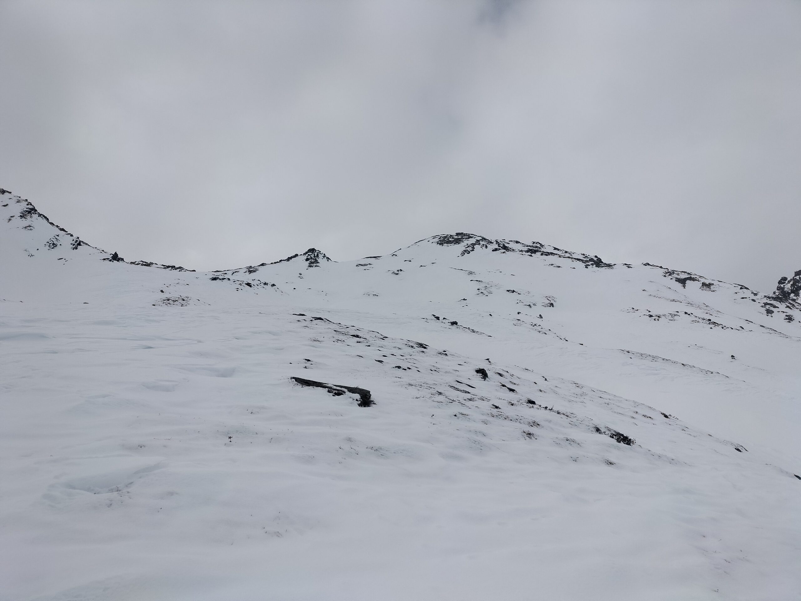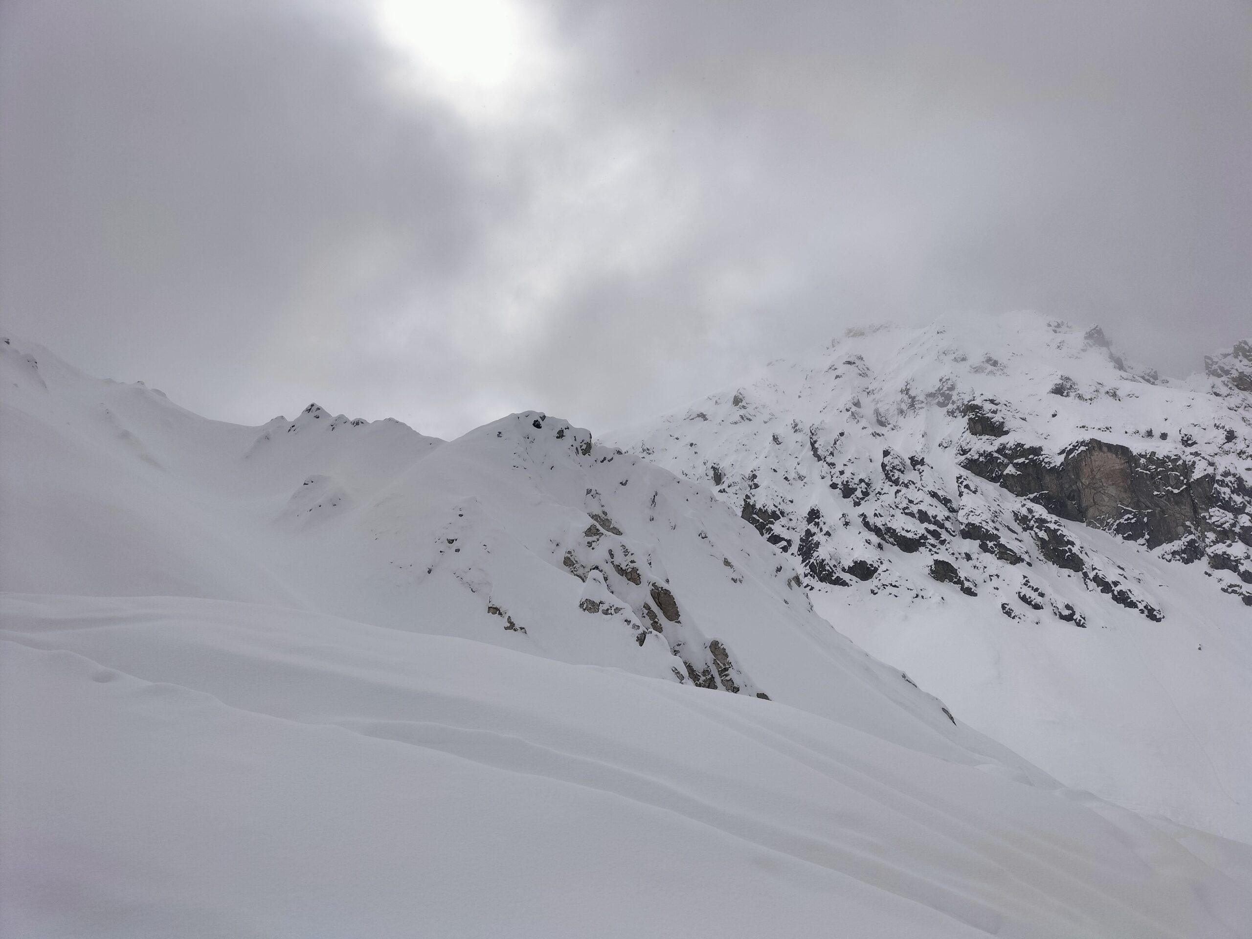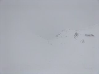 Partiti sotto una debole nevicata con visibilità scarsa ma mai nulla. Salendo i cm di neve fresca aumentano e nascondono le numerose tracce vecchie. Poco…