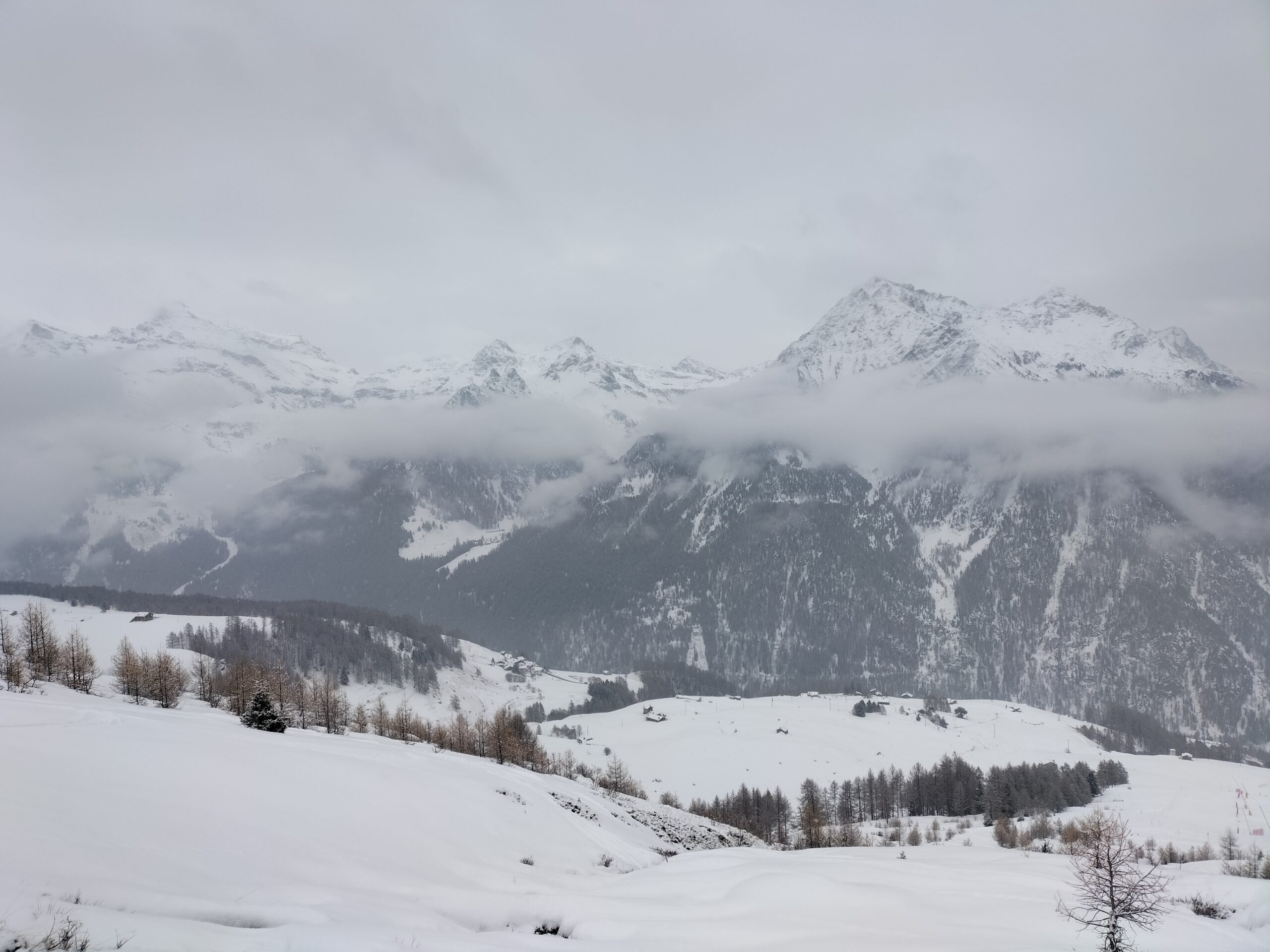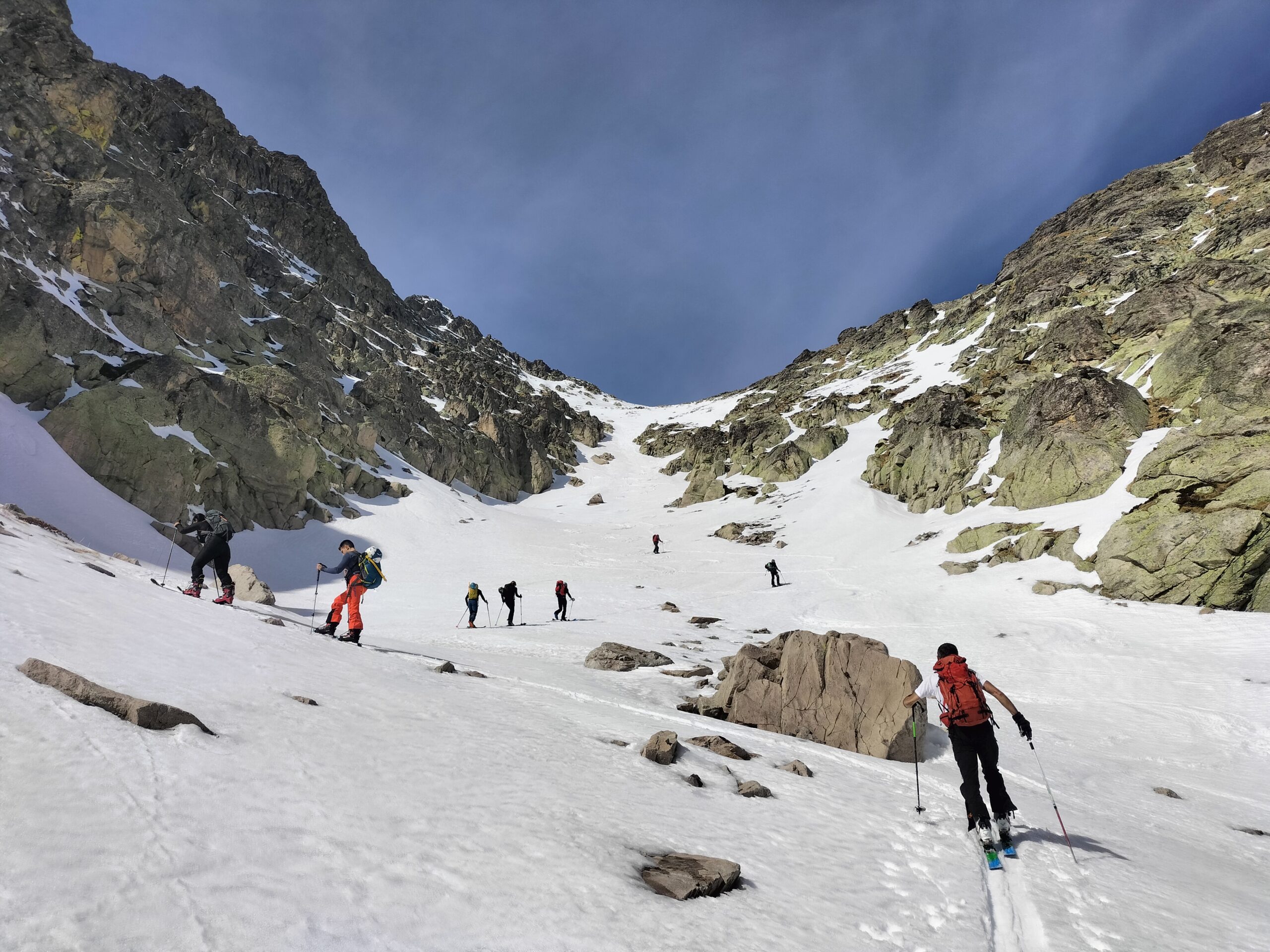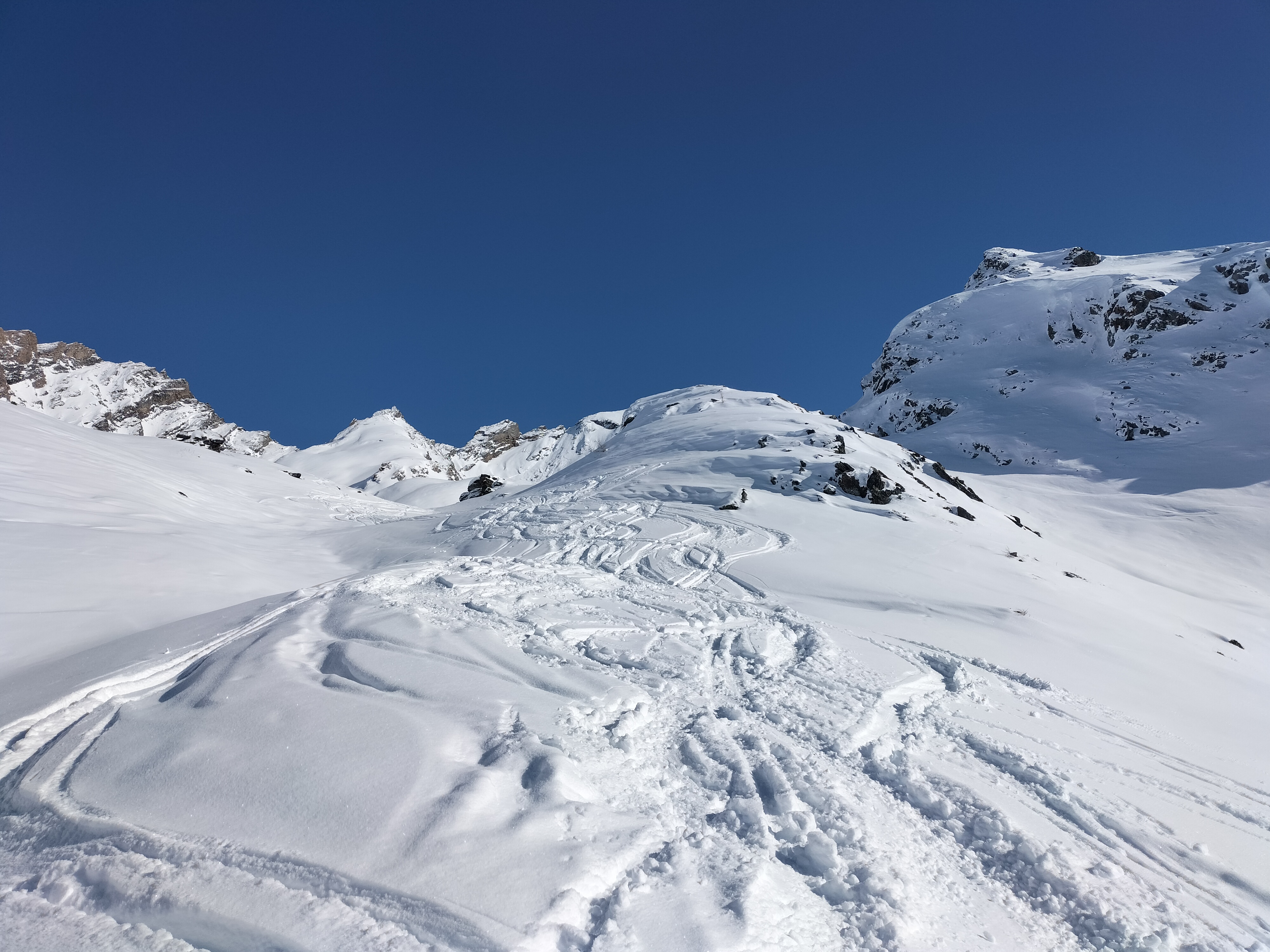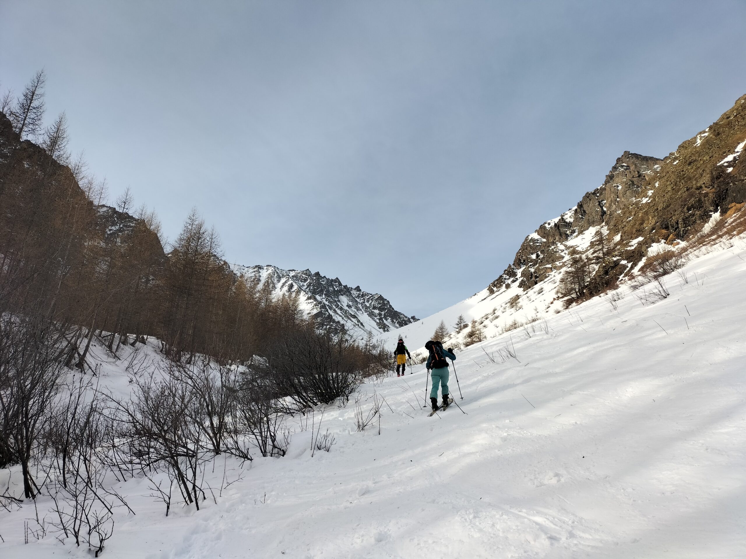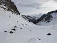 Partiti sotto una debole nevicata con visibilità scarsa ma mai nulla. Salendo i cm di neve fresca aumentano e nascondono le numerose tracce vecchie. Poco…