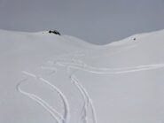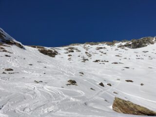Alla partenza meno neve del previsto ,con solo un dito di neve fresca,utile solo a camuffare i sassi. La prima parte è al limite, fuori…