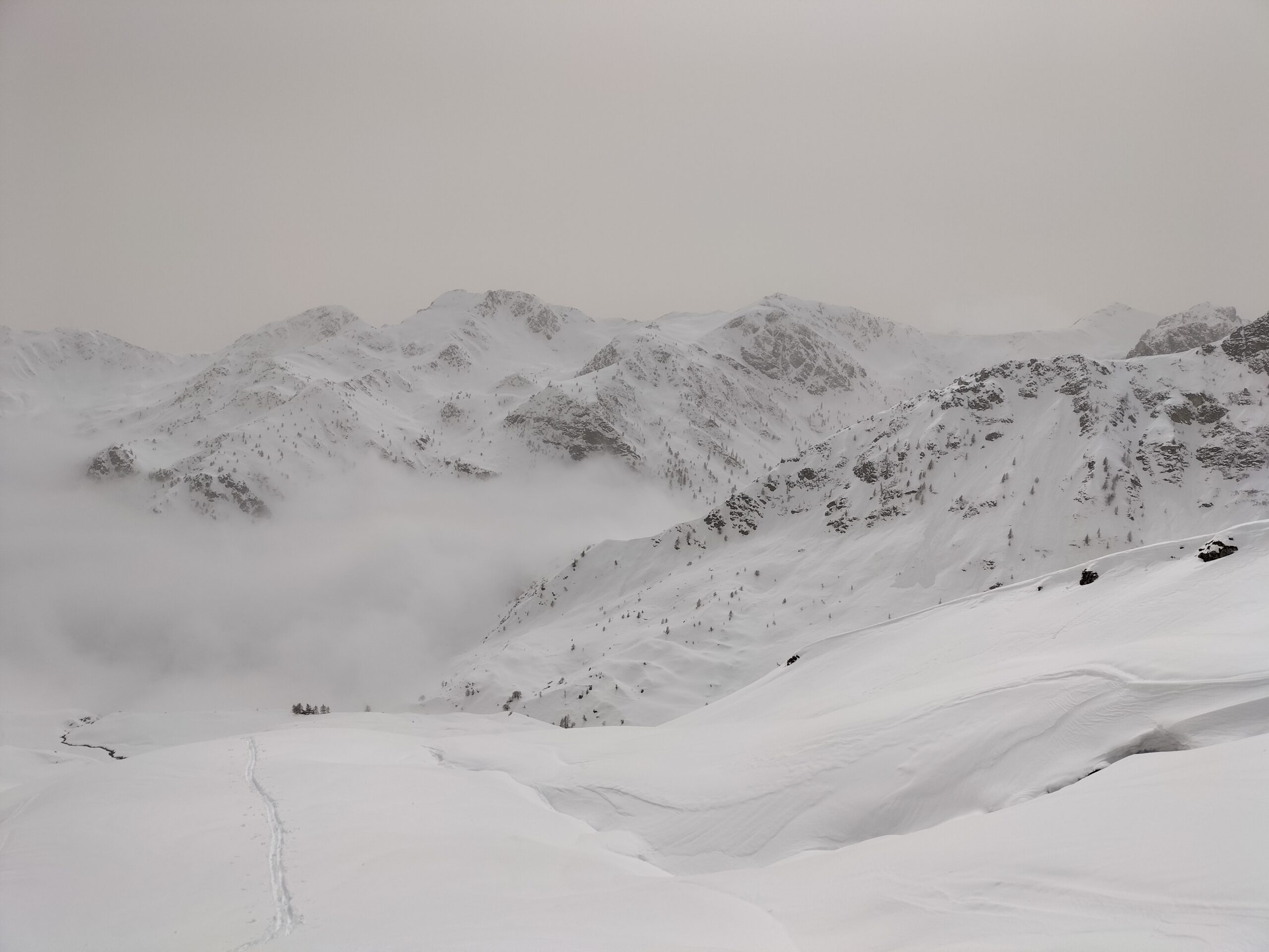 Partiti con l'intenzione di salire la Falinere, abbiamo cambiato programmi per i danni fatti dal vento. In basso tanta farina già battuta, salendo si trovano…
