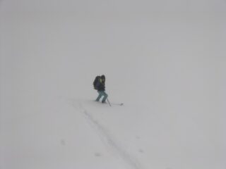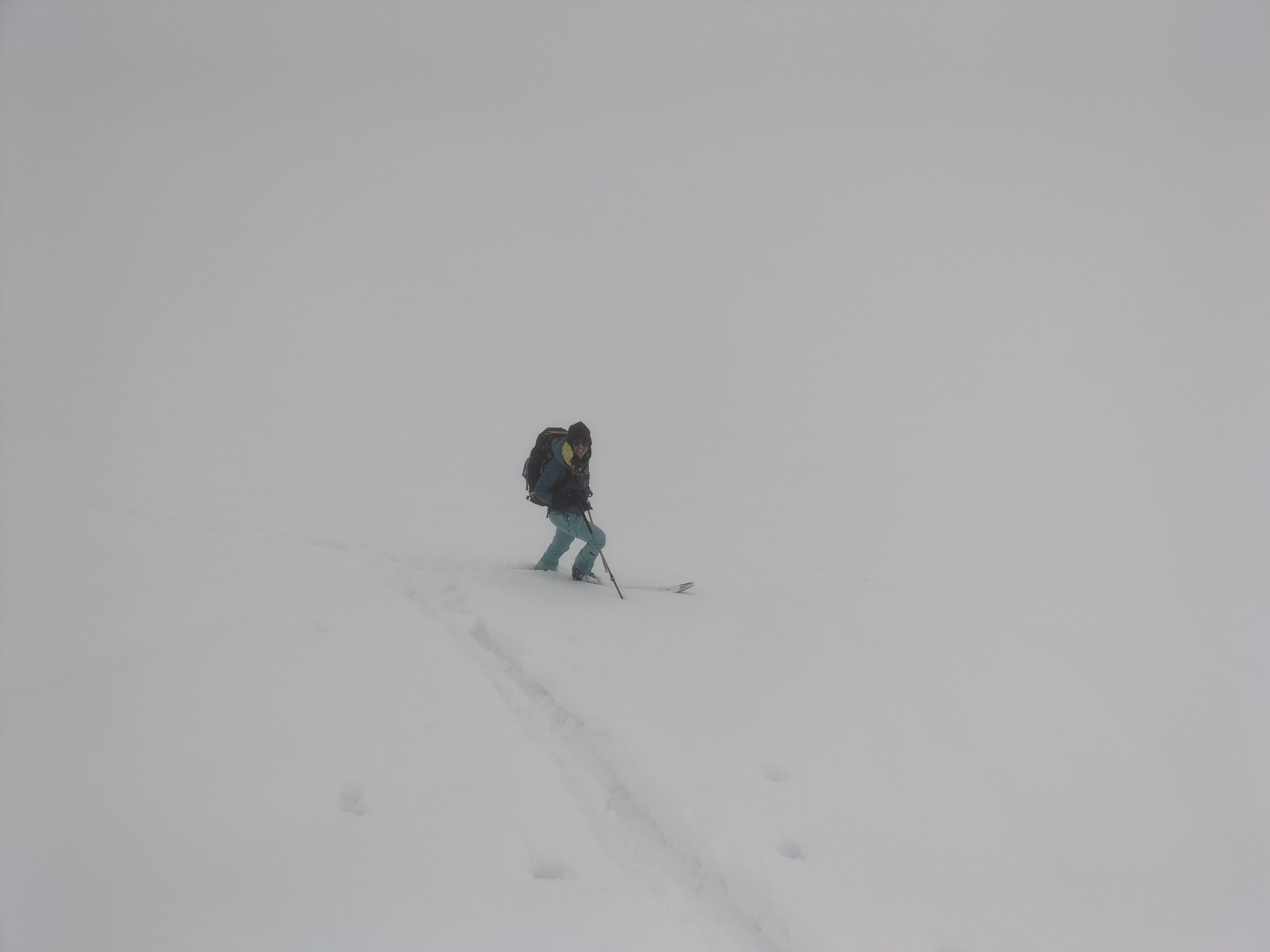 Colto al volo una piccola finestra di tempo discreto. Neve fradicia e pesantissima su tutto il percorso. Dopo 500 m di salita ci siamo fermati…