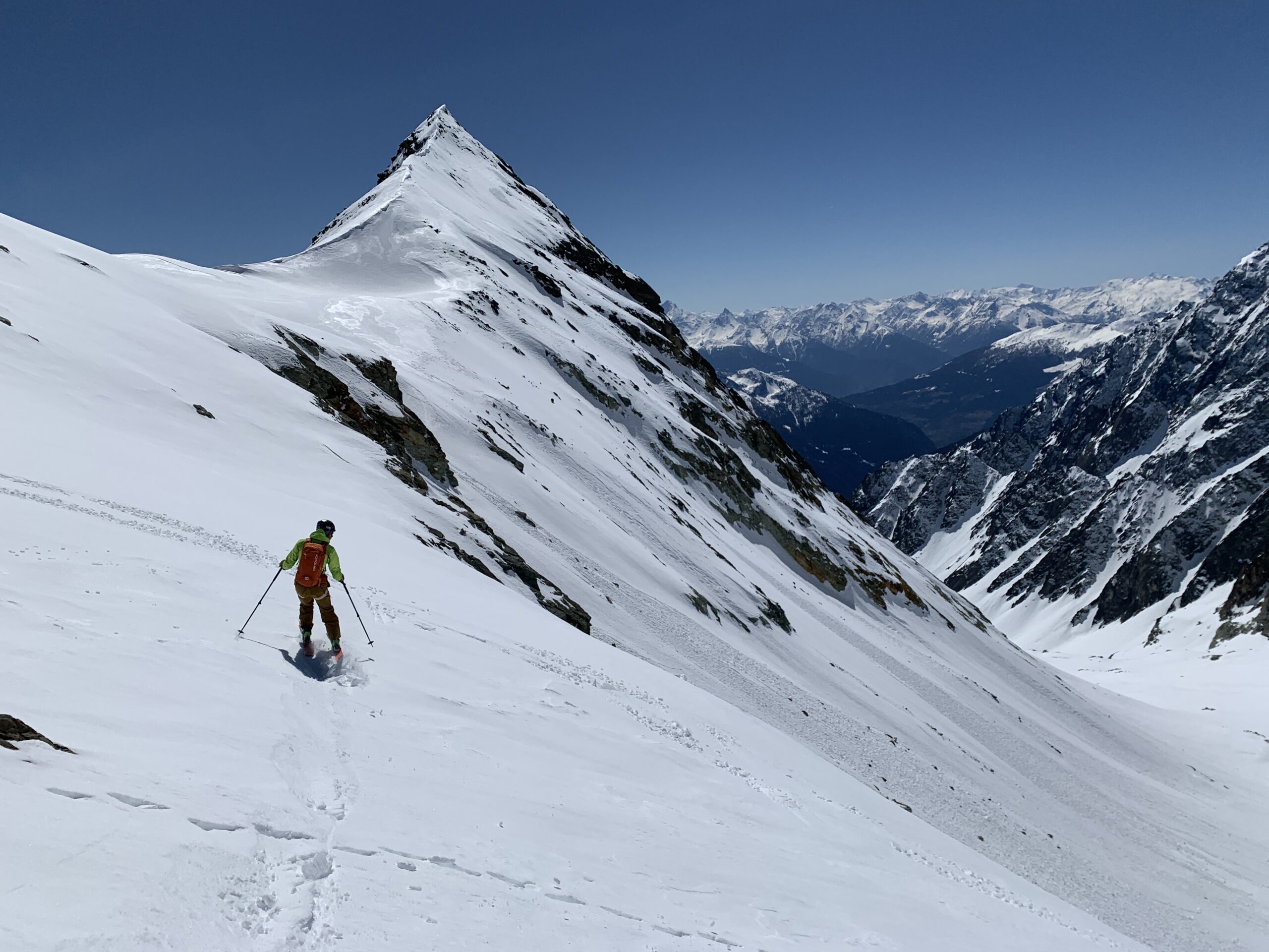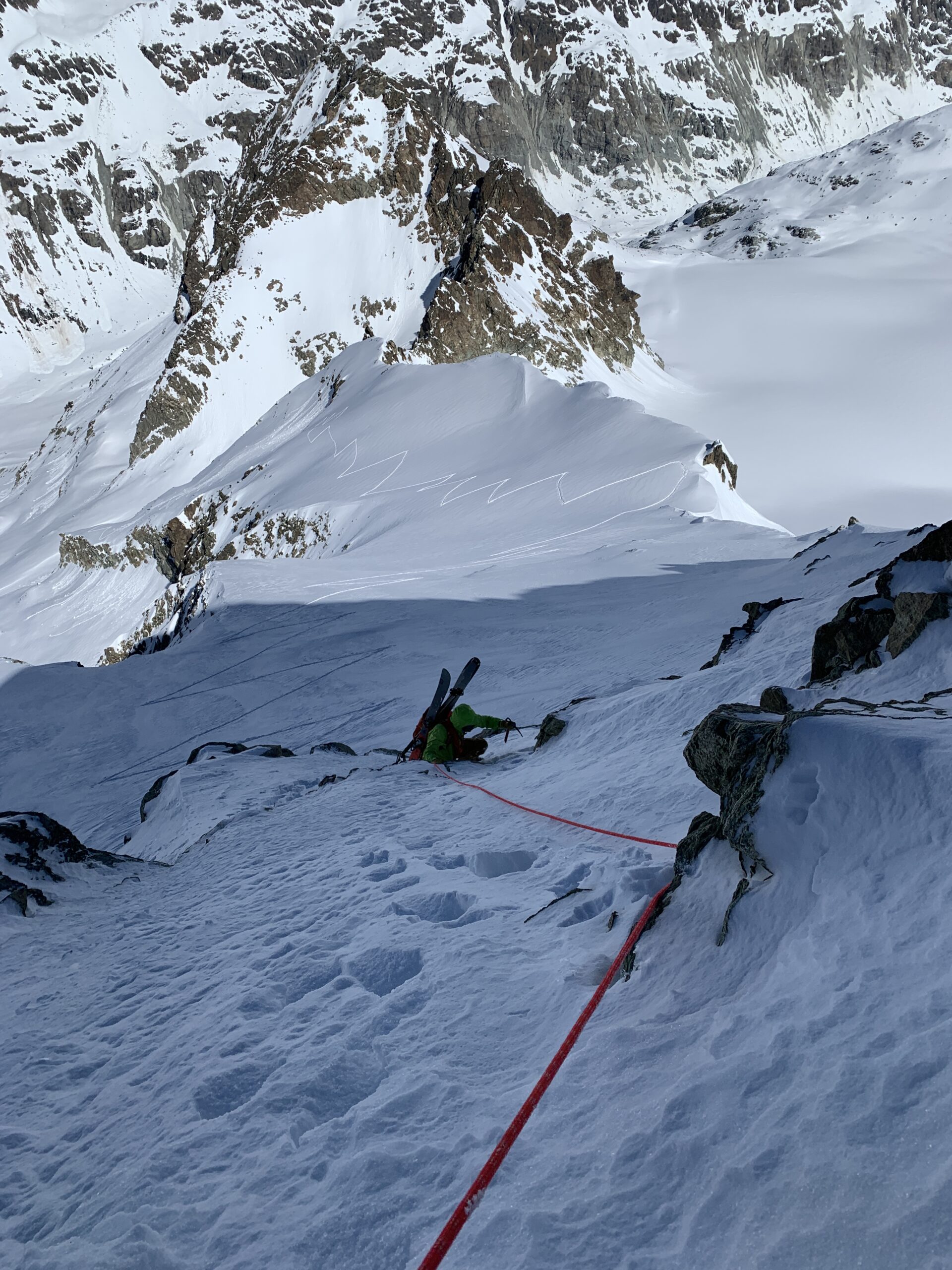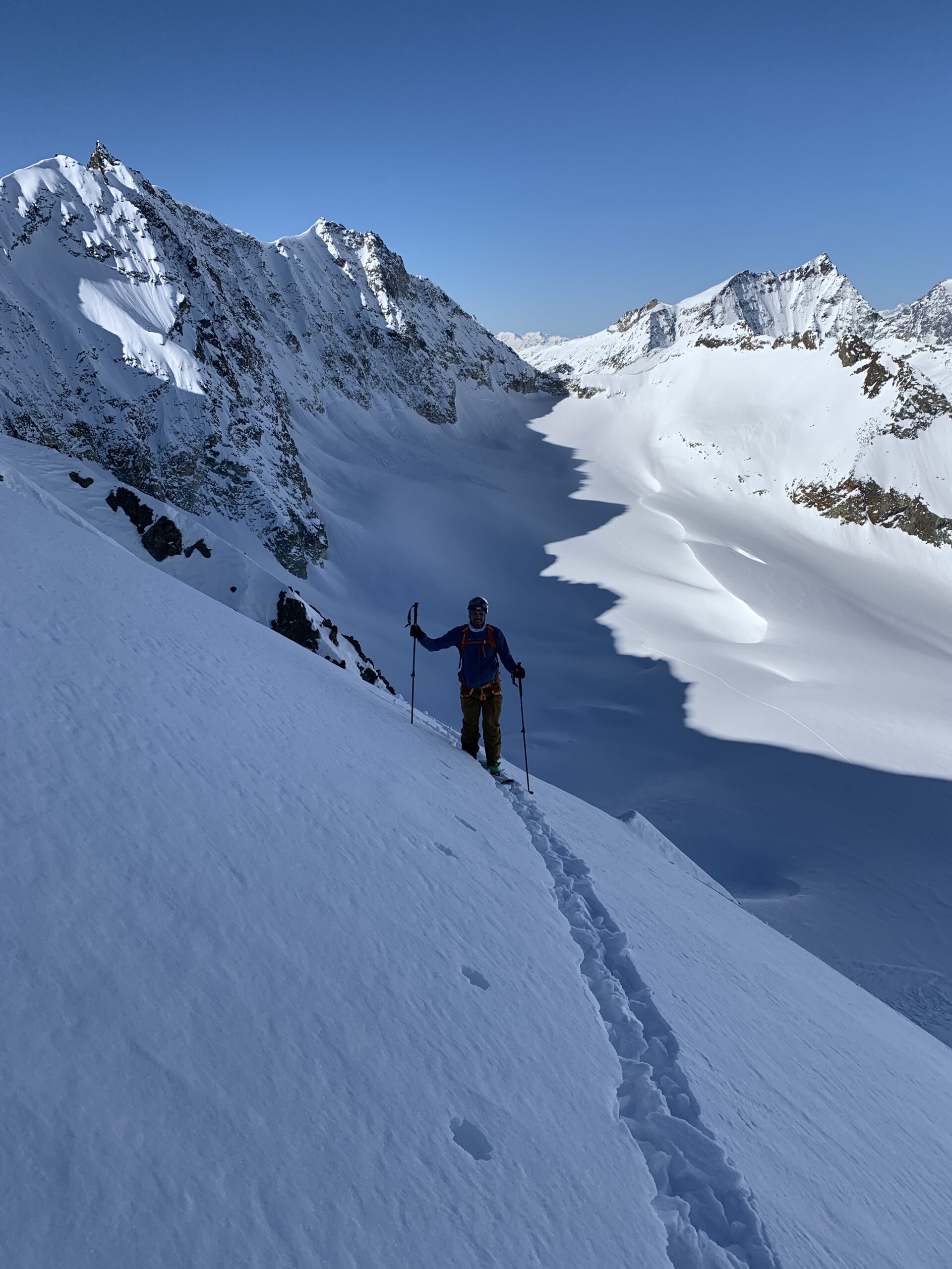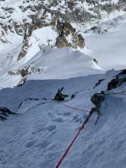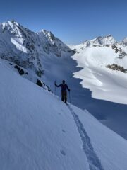 Dopo le nevicate della scorsa settimana non era ancora salito nessuno e abbiamo tracciato dal colle di Chardonnay in poi. Non siamo scesi direttamente sotto…