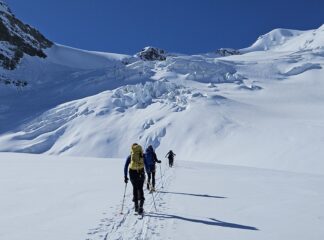 Discesa al ghiacciaio dal rifugio Diavolezza ancora in buone condizioni tra i roccioni. Oggi vento forte e freddo oltre il colletto. Neve di vari tipi, stupenda nella…