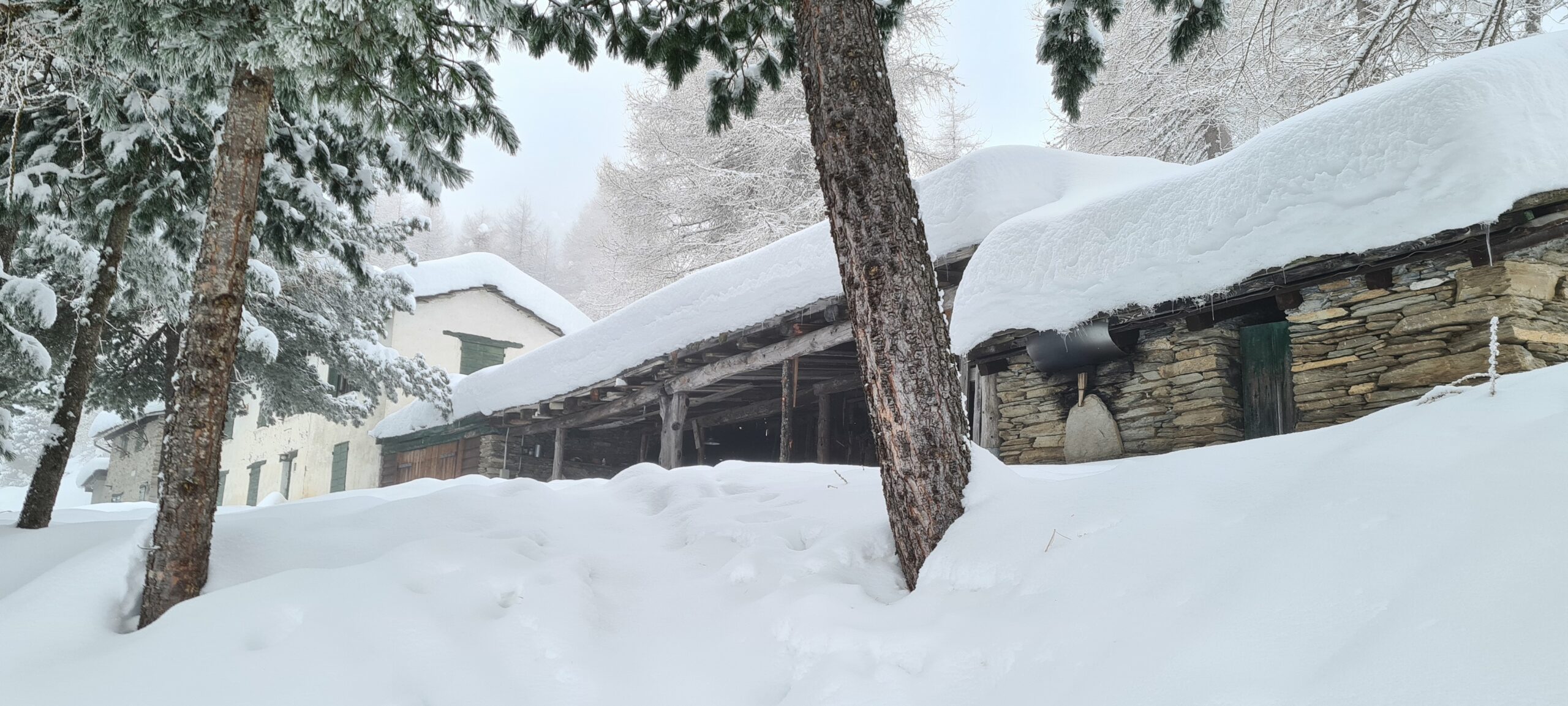 Lasciata l'auto a Menthieu, poco oltre Bonne e saliti subito su dal prato sopra al parcheggio, alle sette. Neve sempre continua. Dopo le baite Arp…