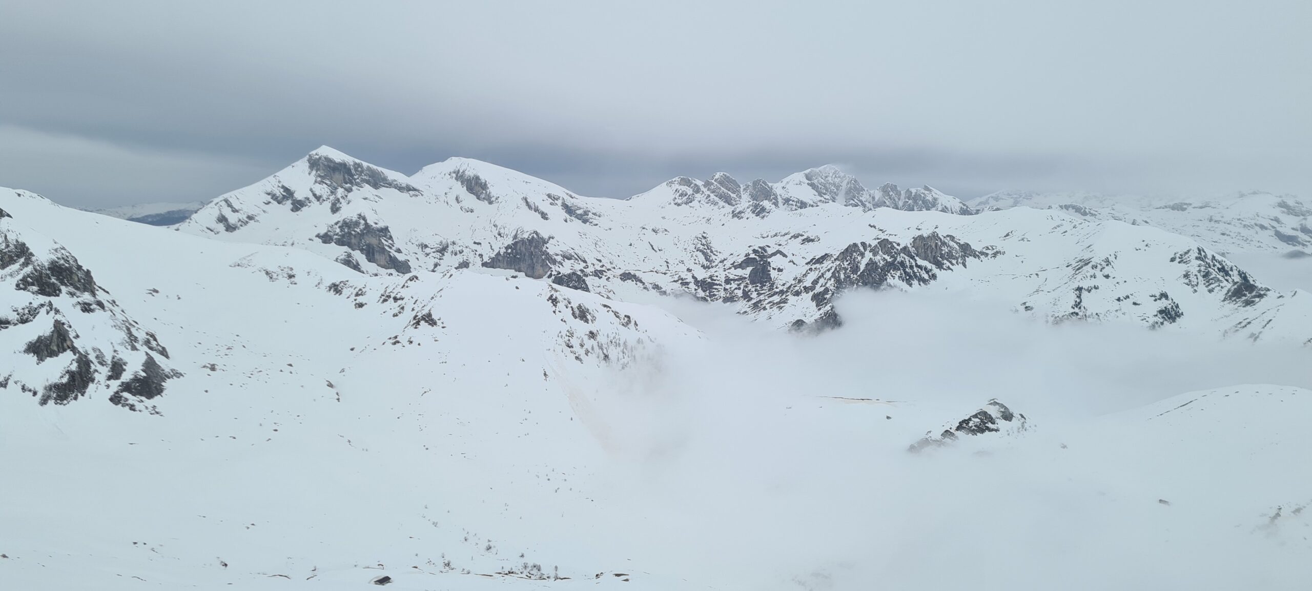 Oggi partenza sempre dal piazzale sotto alle 8.30. Nebbia in agguato che però si è presentata solo dalla Colla Bauzano in su. Neve molto…