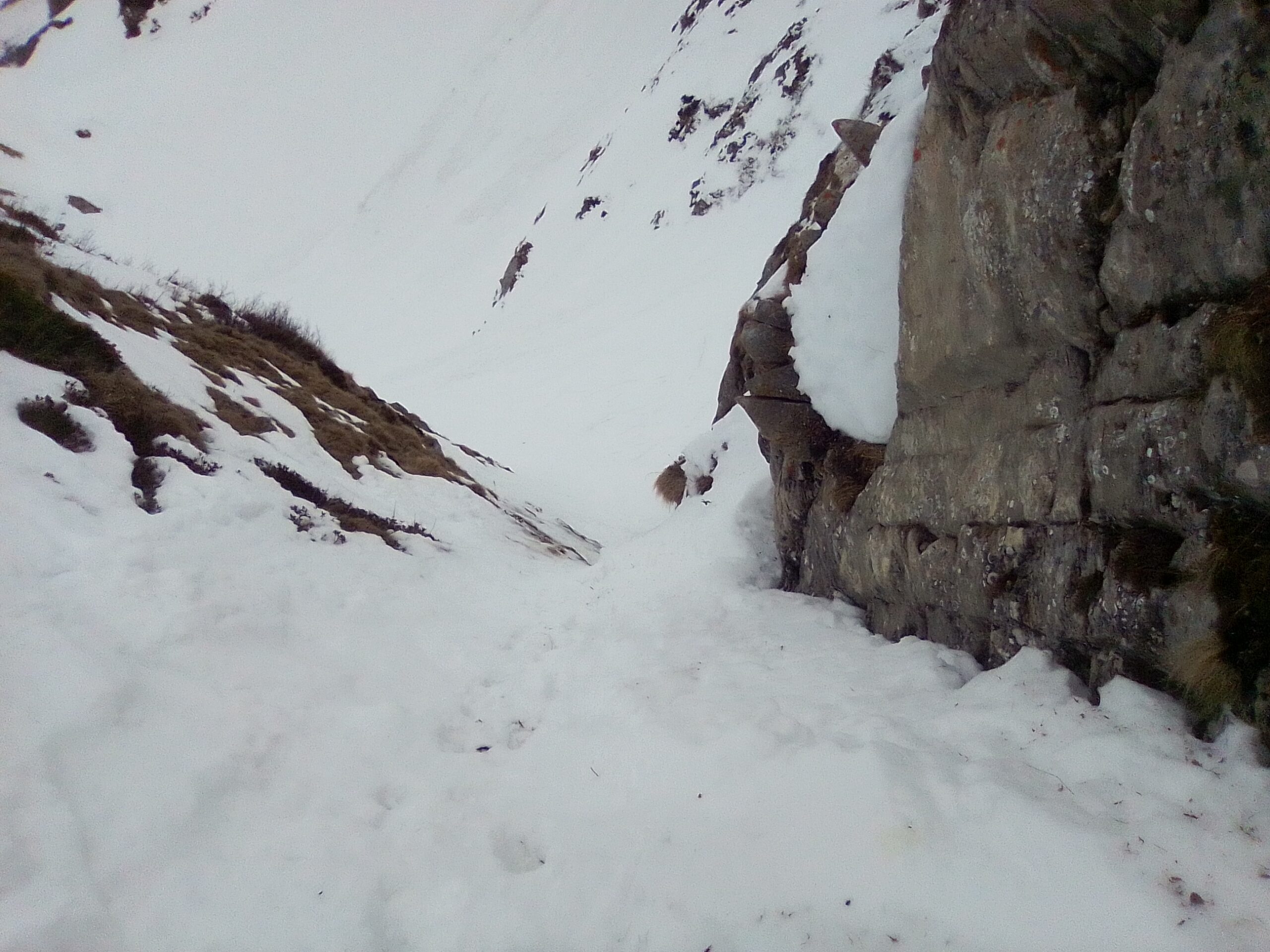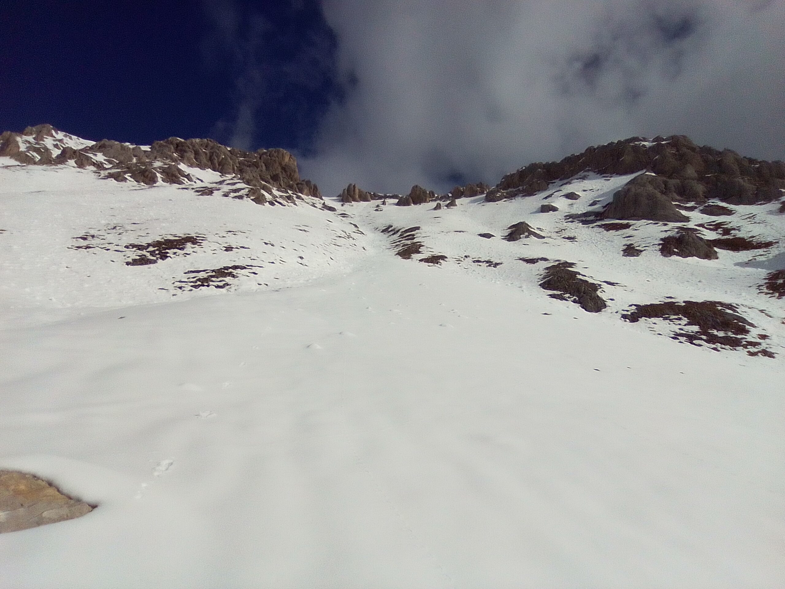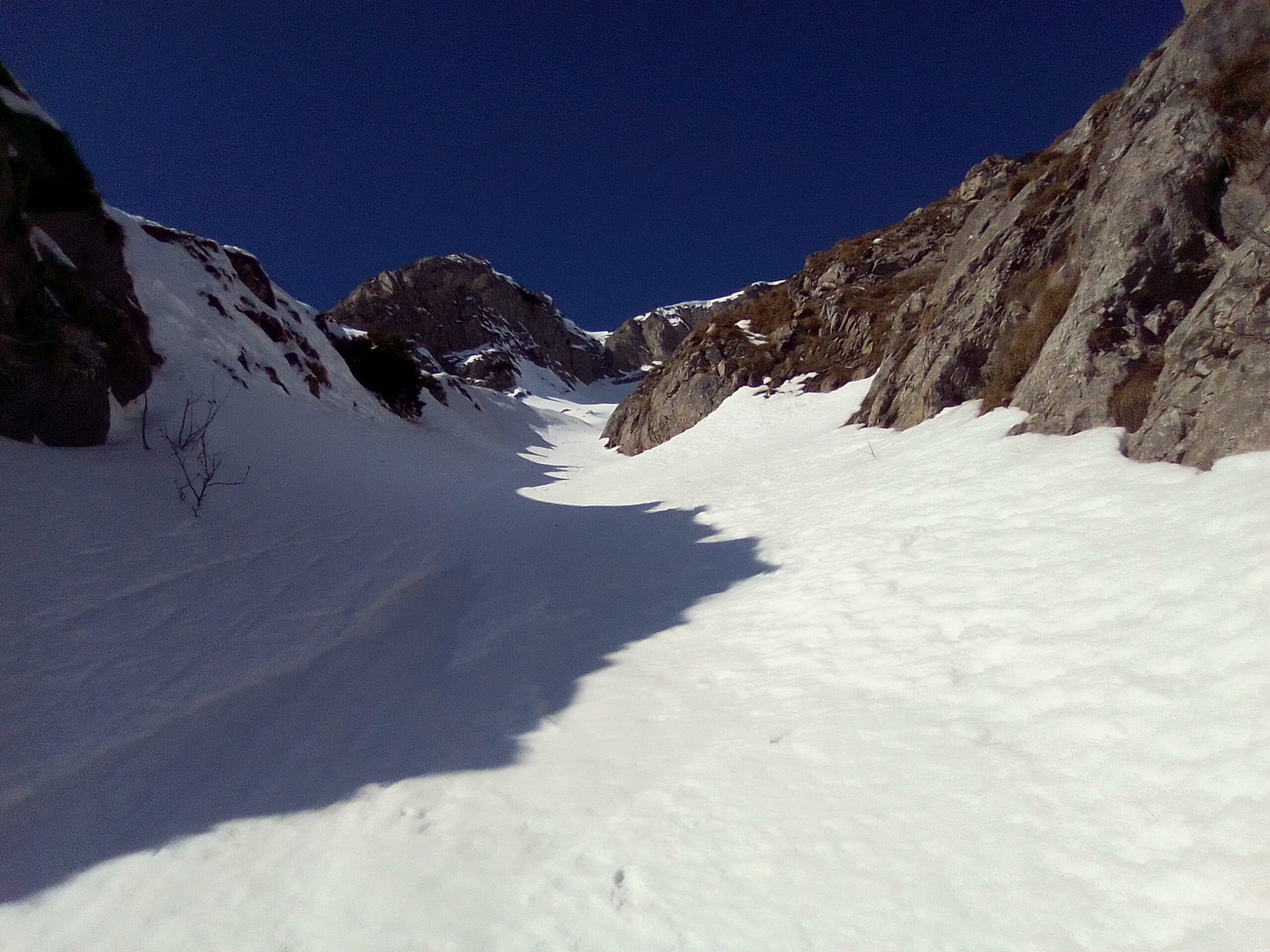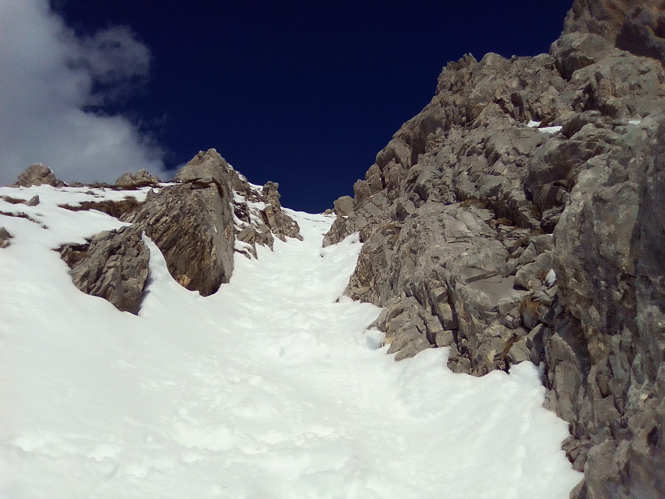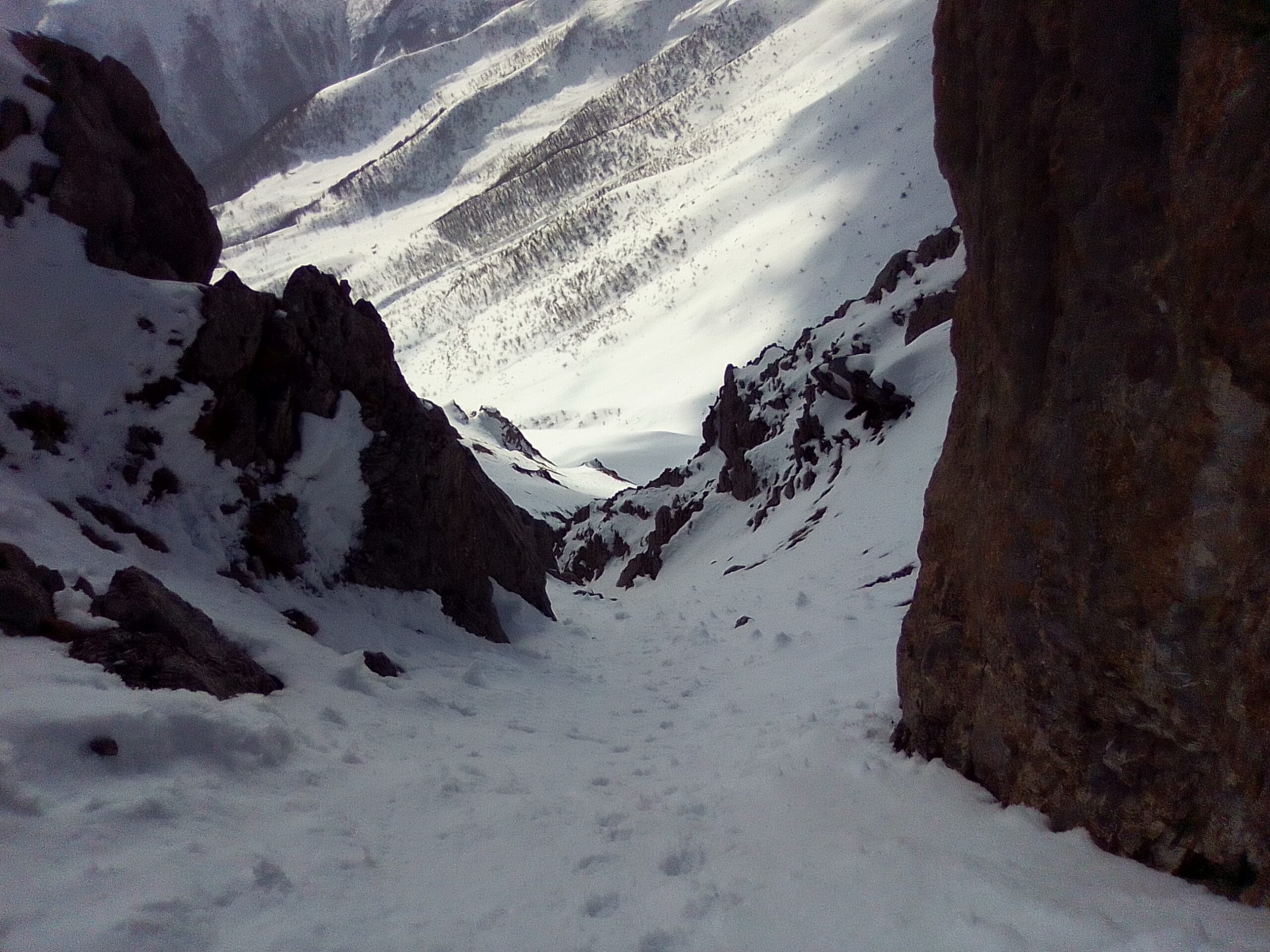 | luciano66 | Gorgia ancora in ombra; già al sole il versante ENE e il canale NE | luciano66 | Nel canale, sguardo indietro | luciano66 | Il canale continua a dx ma si può anche passare a sx su pendio aperto con expo più a est | luciano66 | Parte alta del canale | luciano66 | Passato a sx e poi traverso verso dx, sulla dx non c'è neve continua; al centro la sella 2030 | luciano66 | Dalla sella 2030 ingresso nel camino da sx verso dx e uscita in vetta con breve traverso verso sx (quasi tutto su neve) | luciano66 | Uscita in vetta da sopra | luciano66 | Vetta e cornice in uscita | luciano66 | Tutta la discesa dalla normale | luciano66 | Il versante ENE con il canale NE a ridosso della placconata rocciosa