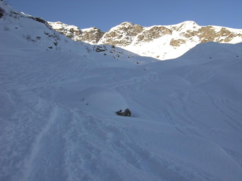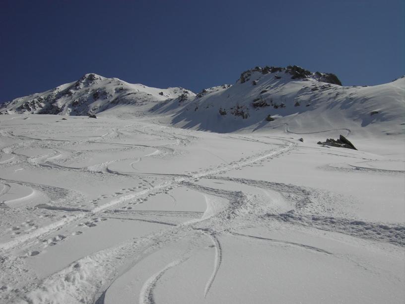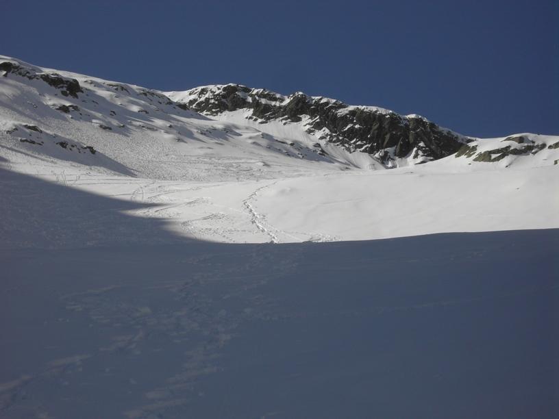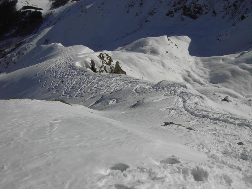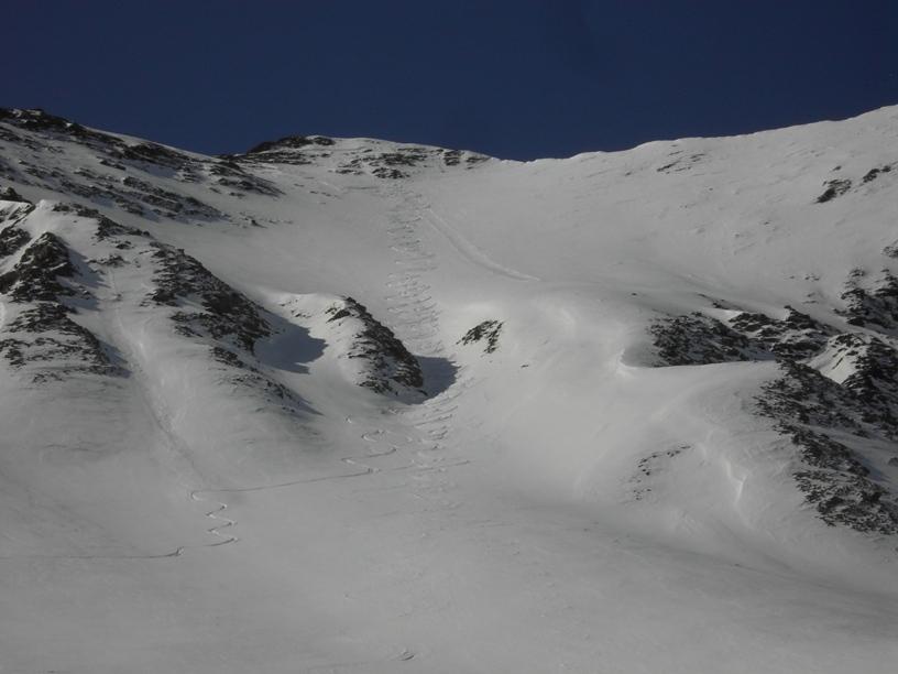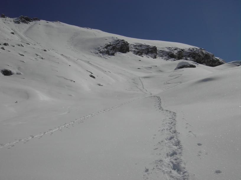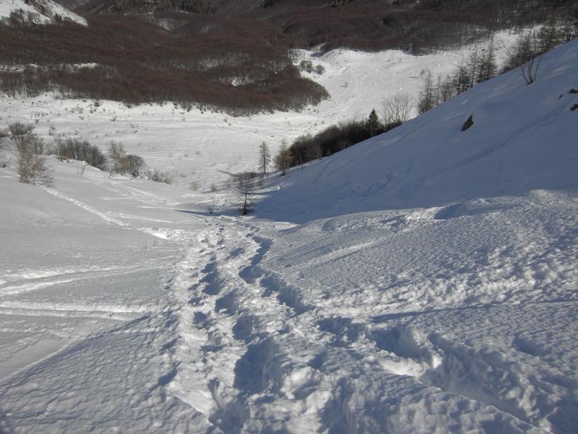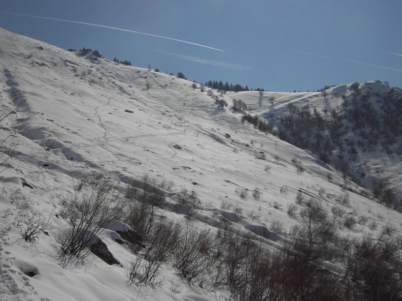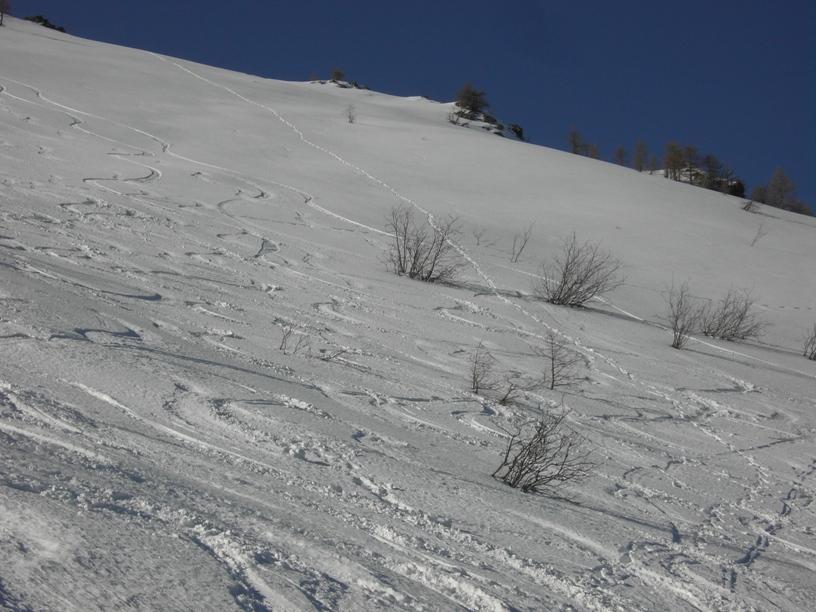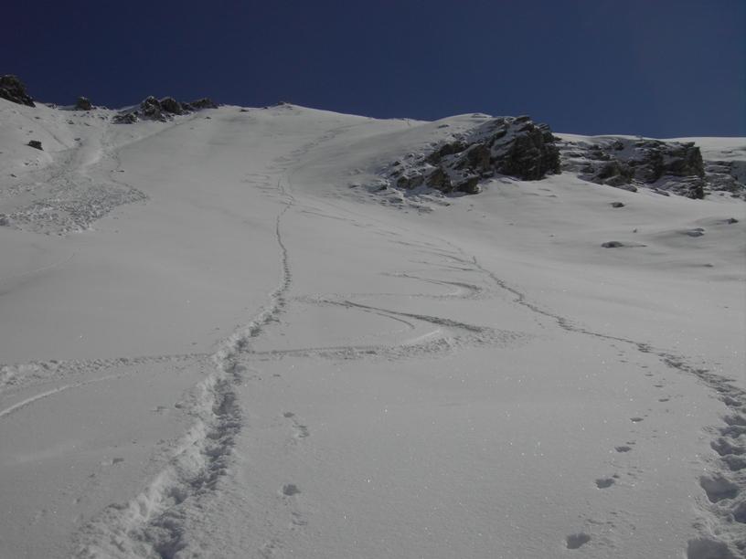 | luciano66 | Cima | luciano66 | Salita a dx,discesa a sx. | luciano66 | Tracciatura in corso al Buc Faraut. | luciano66 | Neve abbondante nella parte superiore. | luciano66 | Ritorno nelle barricate. | luciano66 | Barricate:sentiero estivo. | luciano66 | Uscita dalle barricate.