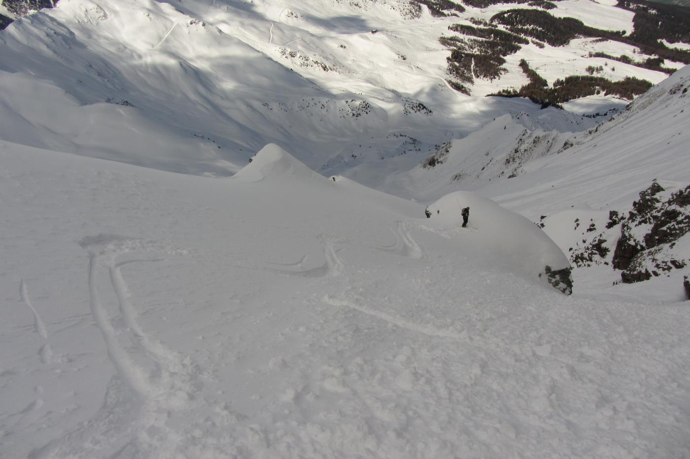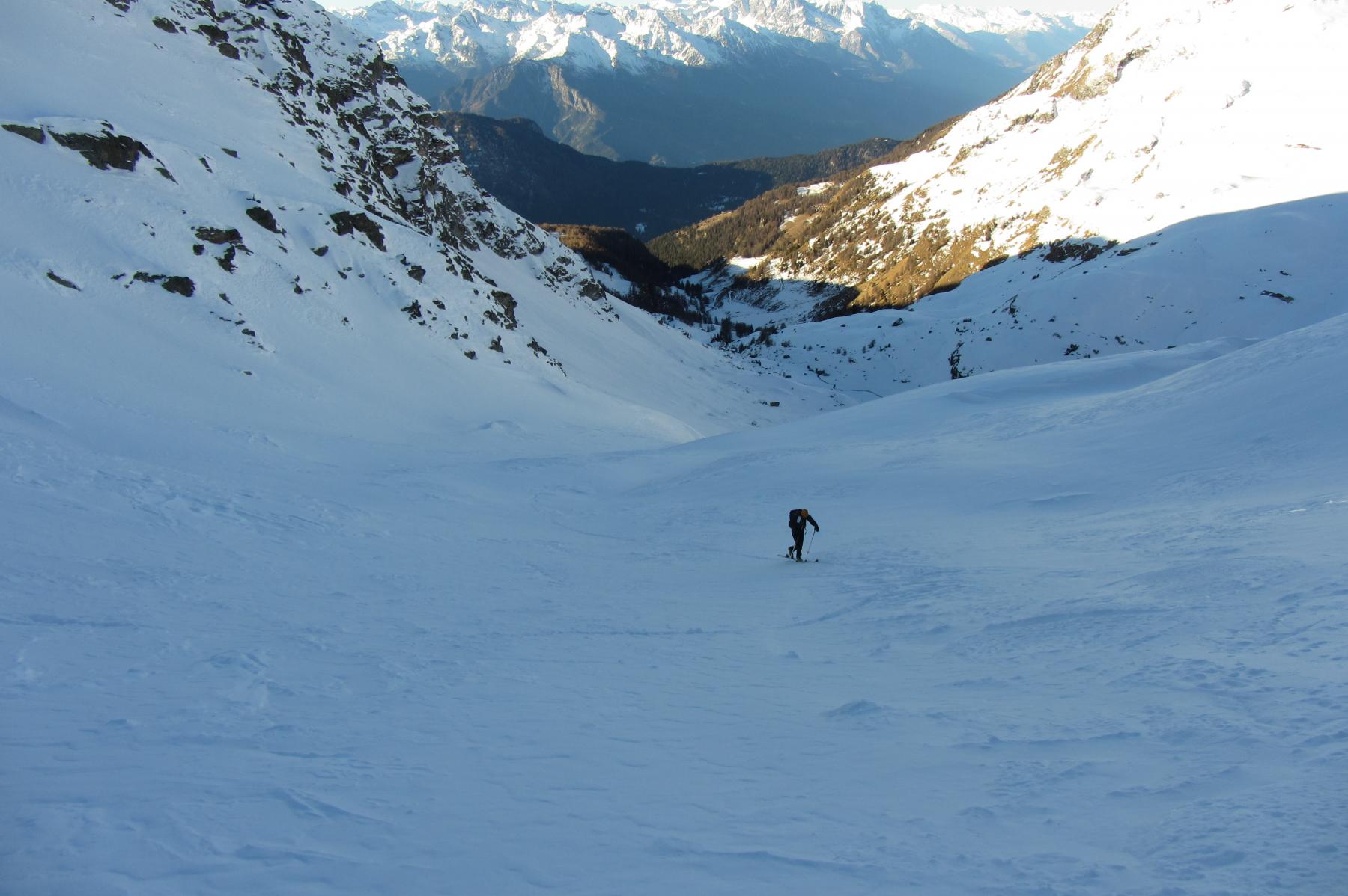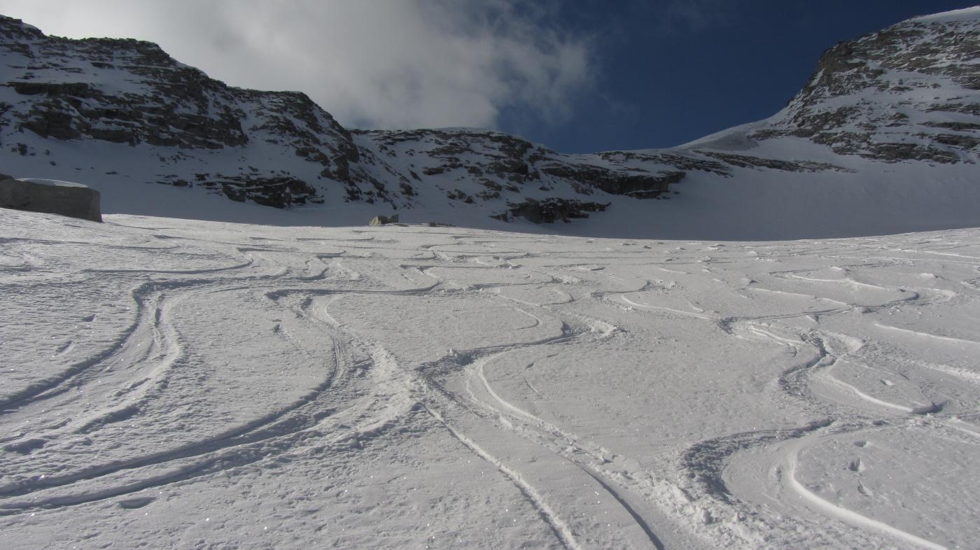 | lupo-solitario | Itinerario di salita in cui si notano il fondo irregolare e i tratti scoperti sotto gli alpeggi di By | lupo-solitario | Uno dei bei canaloni di discesa con al fondo il Plan du Filon | lupo-solitario | Crosta portante e sastrugi al Plan du Filon