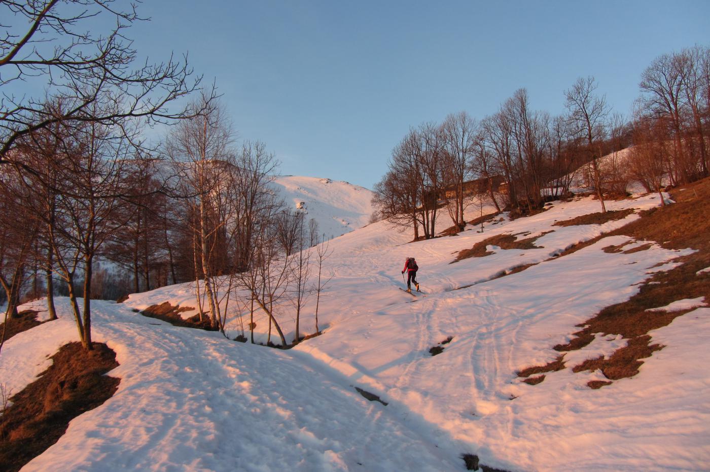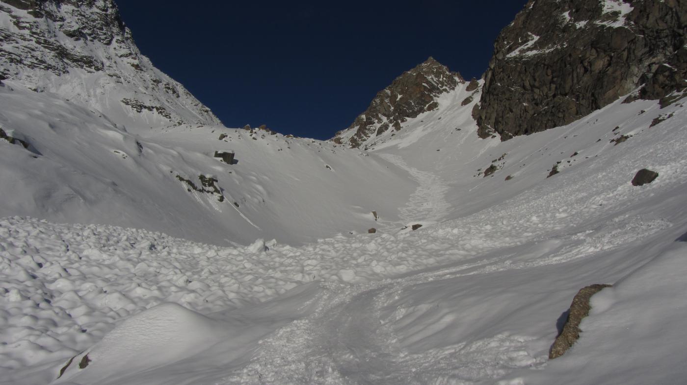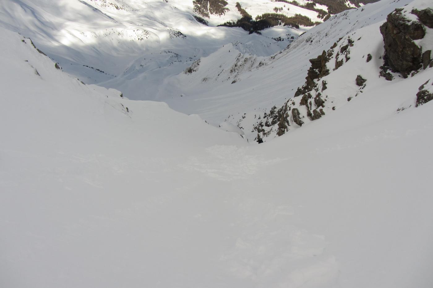 | lupo-solitario | Itinerario di salita in cui si notano il fondo irregolare e i tratti scoperti sotto gli alpeggi di By | lupo-solitario | Uno dei bei canaloni di discesa con al fondo il Plan du Filon | lupo-solitario | Crosta portante e sastrugi al Plan du Filon