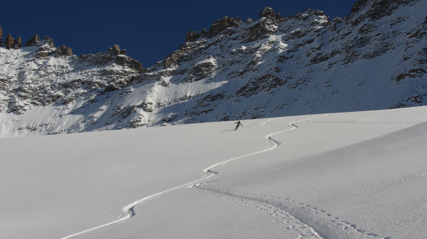 | lupo-solitario | Partenza sci ai piedi dalla quota 2800 verso il Truc Blanc | lupo-solitario | La linea seguita per scendere dal Truc Blanc vista dal Col Giasson | lupo-solitario | Bella discesa sul ghiacciaio di Giasson