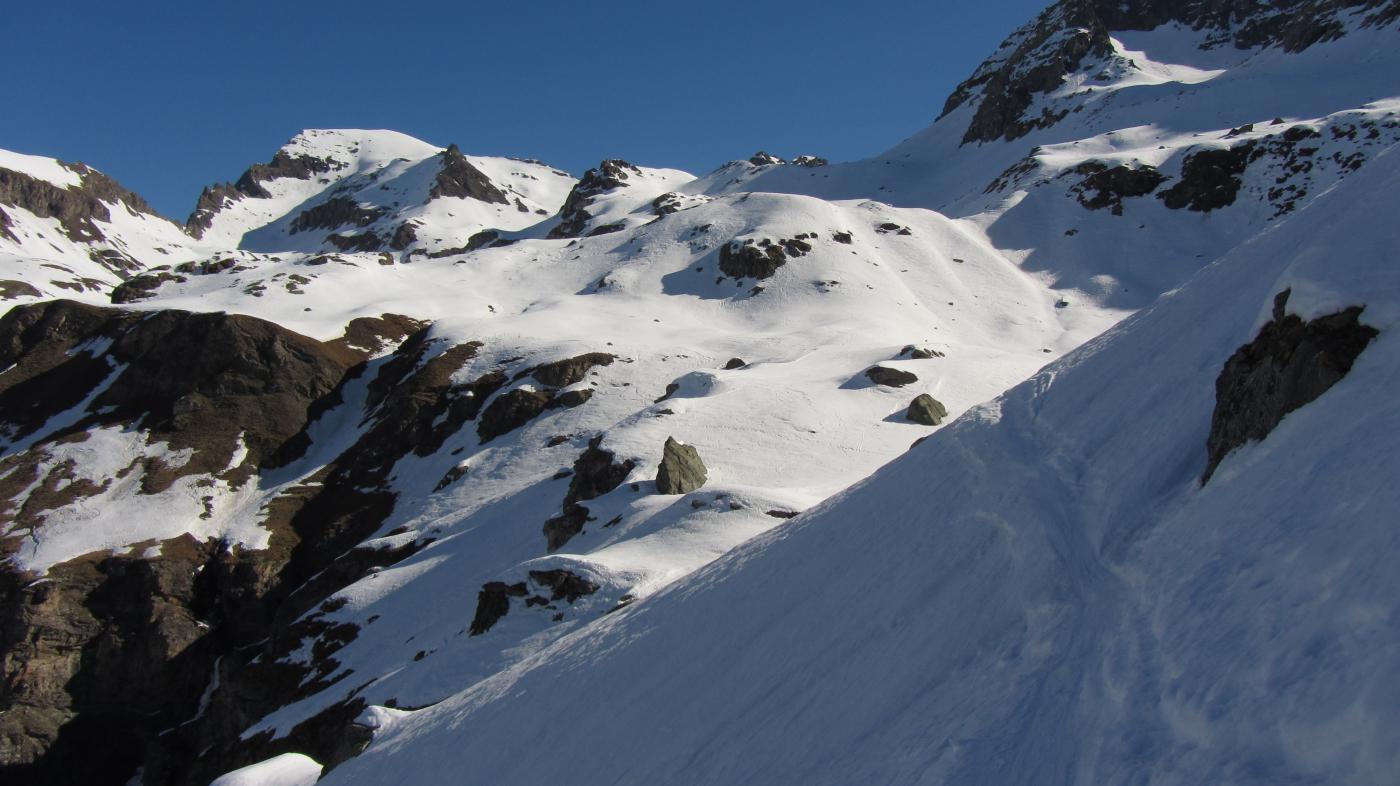 | lupo-solitario | Slavina scesa dal becco della tribolazione | lupo-solitario | Il tratto dopo il colle dei becchi verso il Blanc Giuir | lupo-solitario | Ancora buon innevamento sul percorso per il colle dei becchi