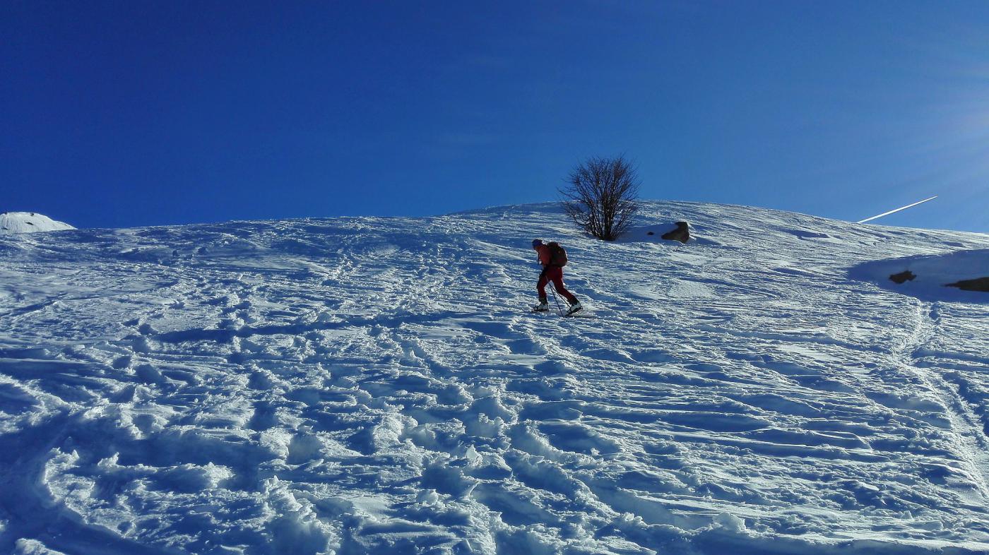 Traccia pessima, una gruviera in seguito al passaggio di numerosi ciaspolatori. In alto ancora un po' di farina, ma molto lavorata. Dal bosco crosta e quindi neve…