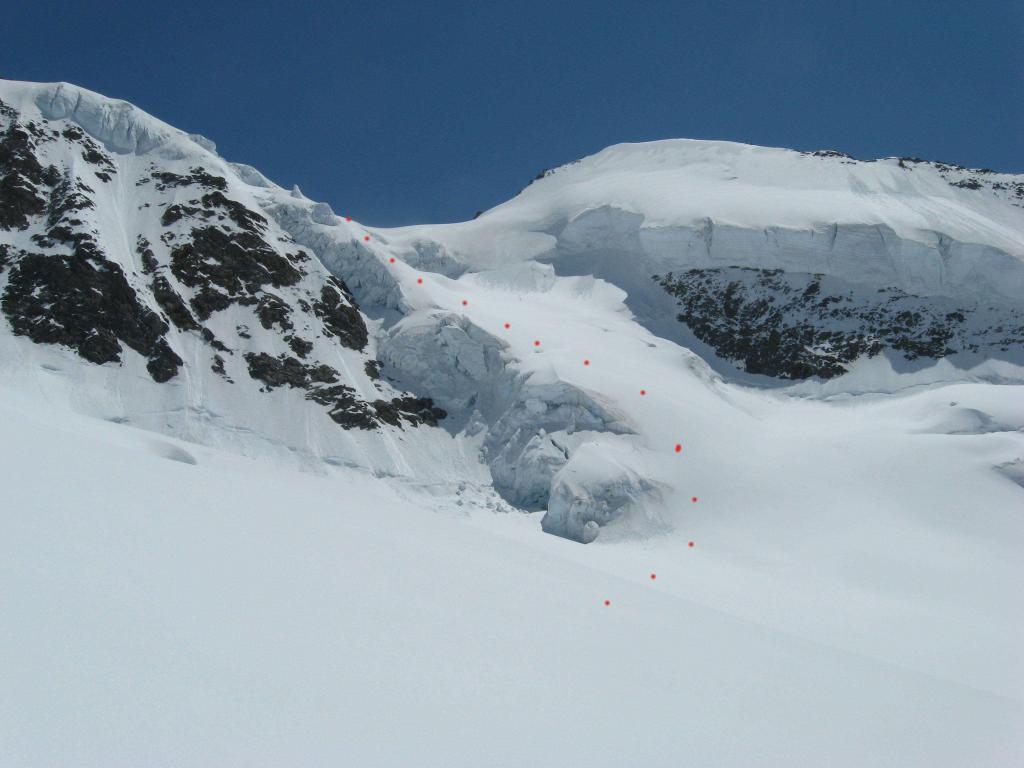 | m-gulliver | I due percorsi visti dal ghiacciaio | m-gulliver | I due percorsi visti dal versante opposto della valle (aprile 2013) | m-gulliver | Verso l'uscita del canale inferiore | m-gulliver | Sulla fascia mediana verso il muro finale | m-gulliver | Poco sotto l'uscita in cresta | m-gulliver | Verso la vetta | m-gulliver | Cresta di discesa dalla cima | m-gulliver | La cresta percorsa in discesa vista da poco prima di raggiungere il colle del Carro