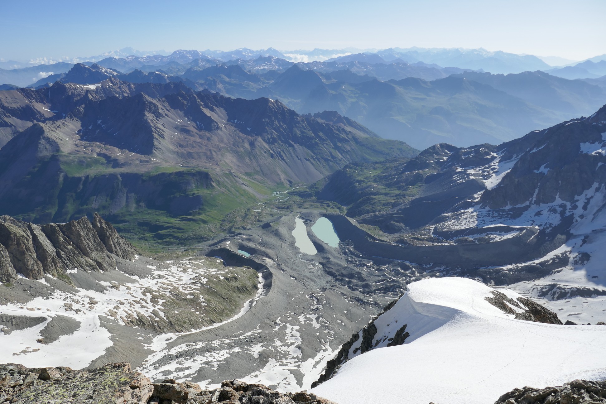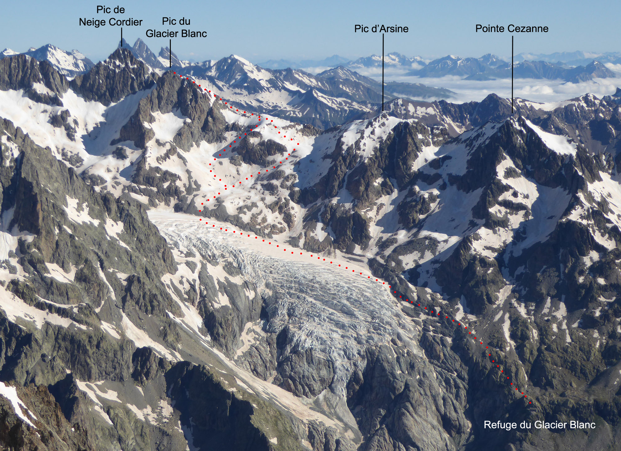| m-gulliver | Percorso classico a dx e variante a sx (foto inizio luglio 2016) | m-gulliver | sopra la morena verso il col du Glacier Blanc | m-gulliver | la comba laterale del percorso diretto, a sx la cima | m-gulliver | Pendio finale | m-gulliver | dalla vetta verso il lac d'arsine e la sinuosa cresta nevosa finale | m-gulliver | Glacier blanc