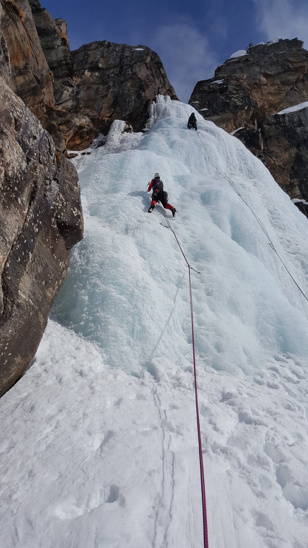 Spettacolare nel sole, poderoso pilastro di ghiaccio azzurro illuminato dal sole. Tanti gradini tanti buchi. Il piacere di arrampicare su ghiaccio ripido con spensieratezza.…