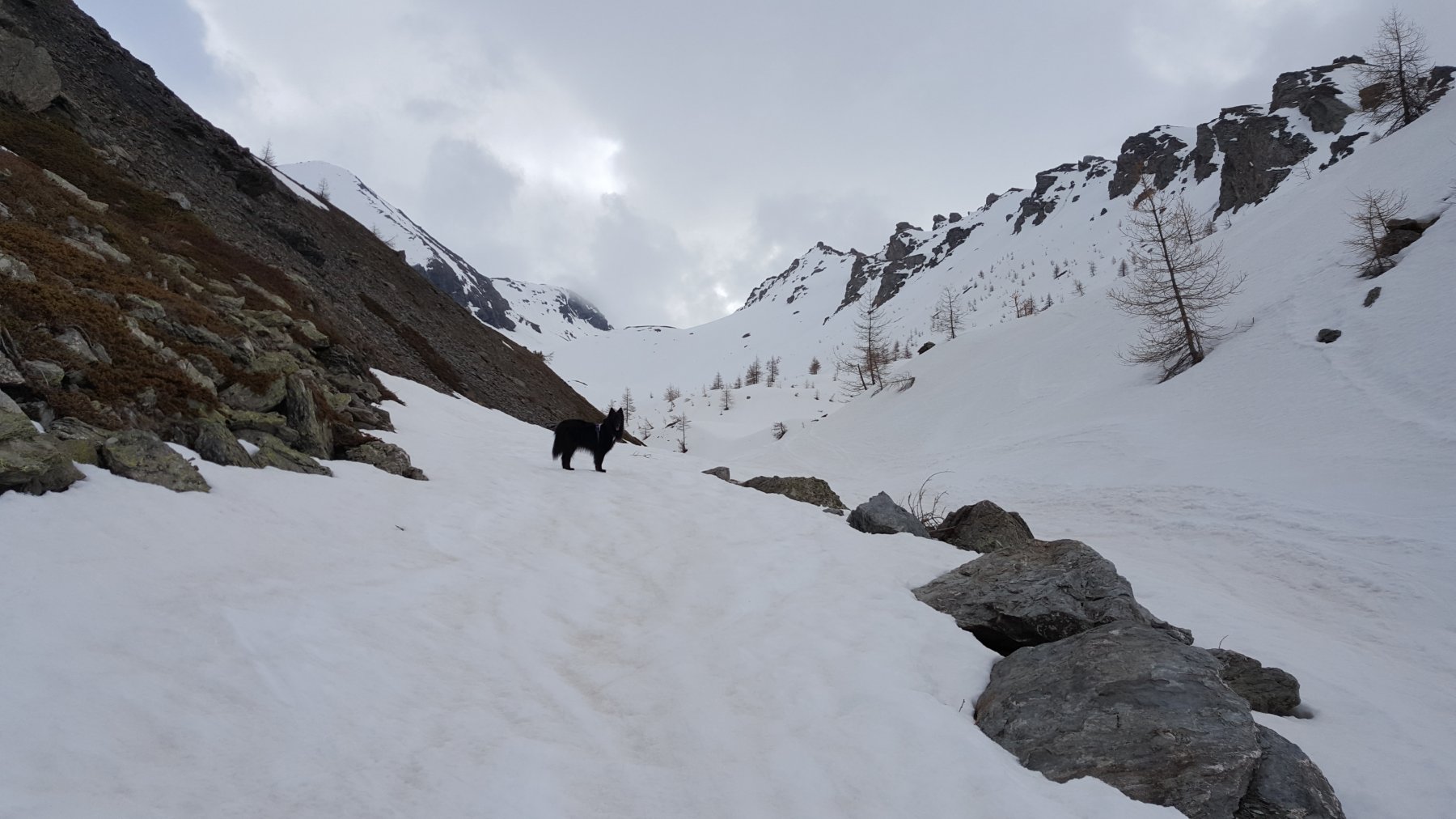 Bella. Partiti ore 715 iniziata discesa ore 1030. Fattibile col cane perché tiene bene in salita e in discesa non sprofonda troppo. Con Franco…