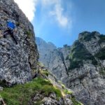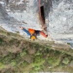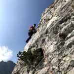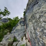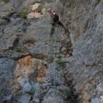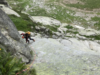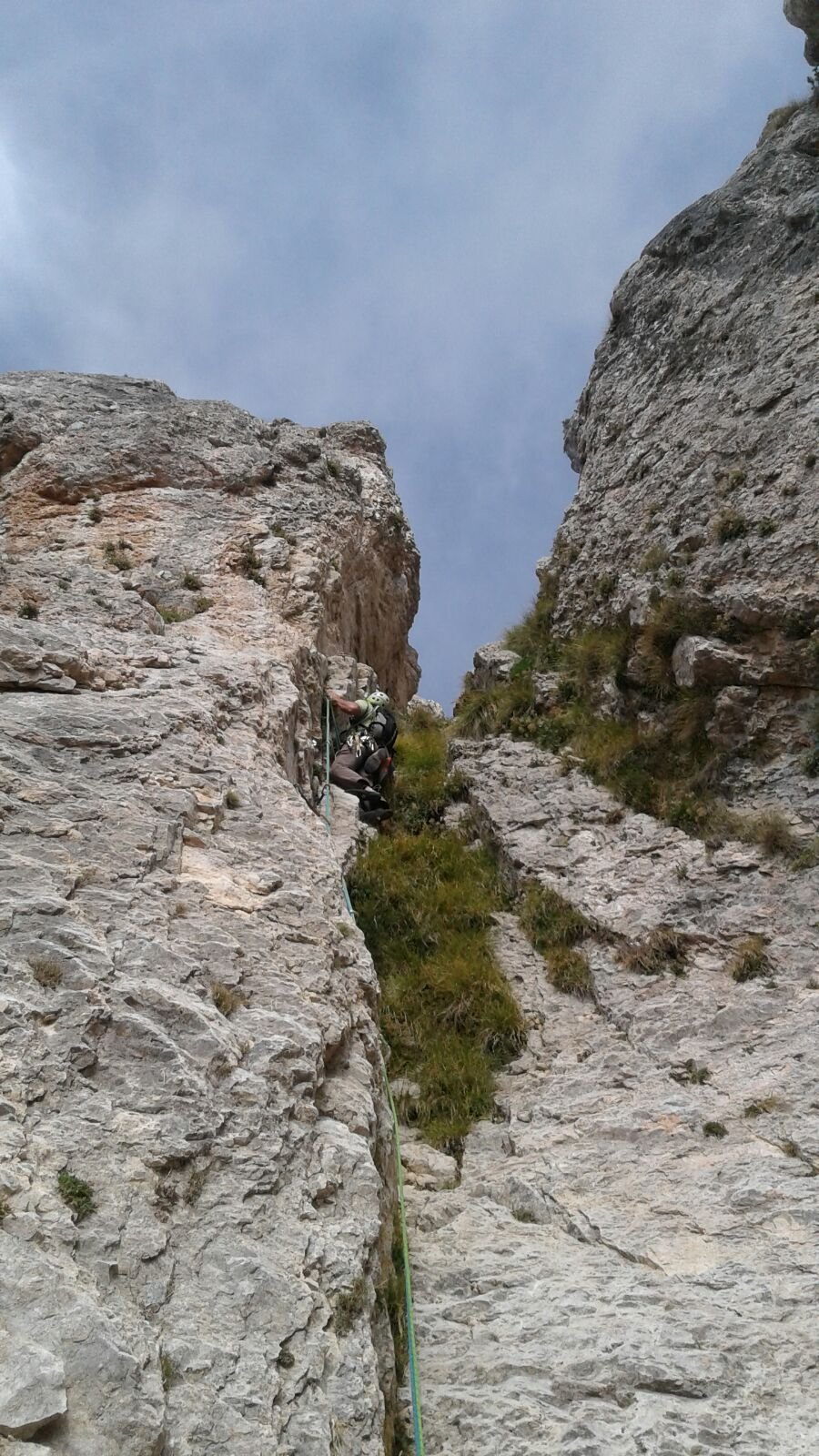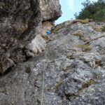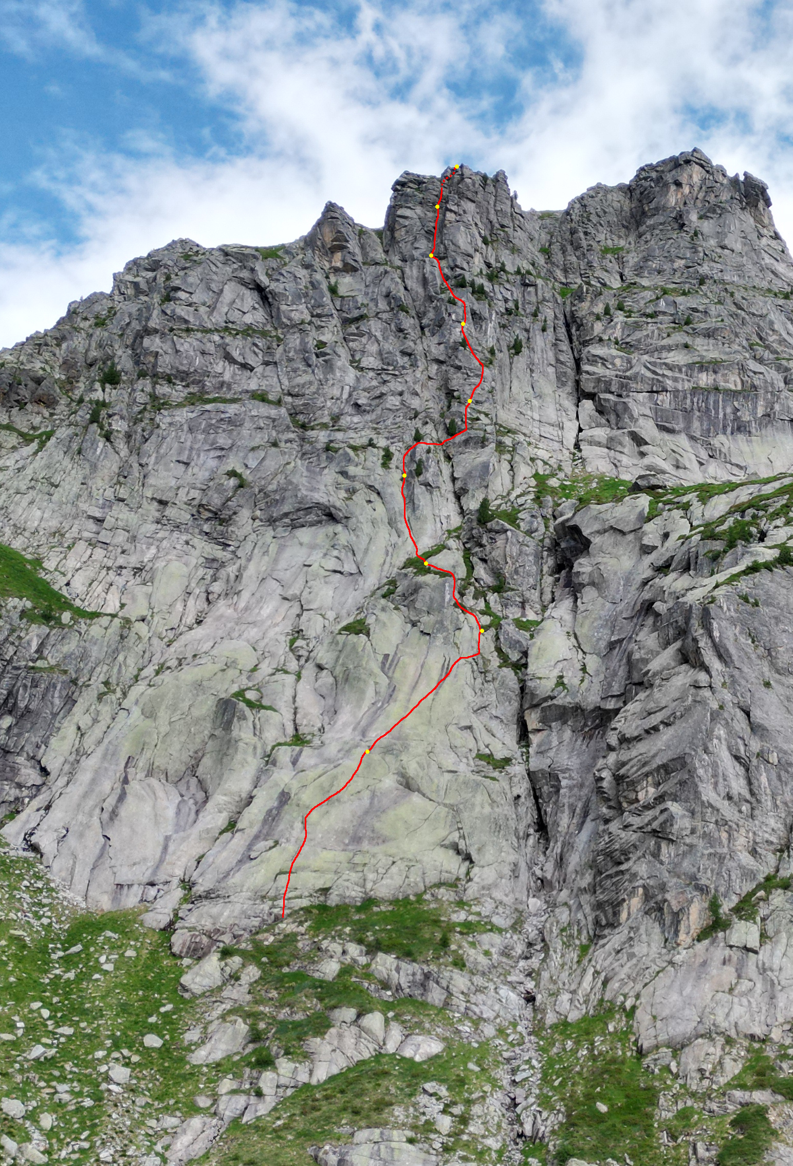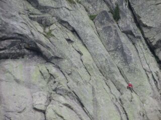 Via sufficientemente protetta con fix, chiodi e cordoni su massi incastrati, soste tutte comode, rientro a doppie possibile fino alla sesta lunghezza. Si alternano placche…