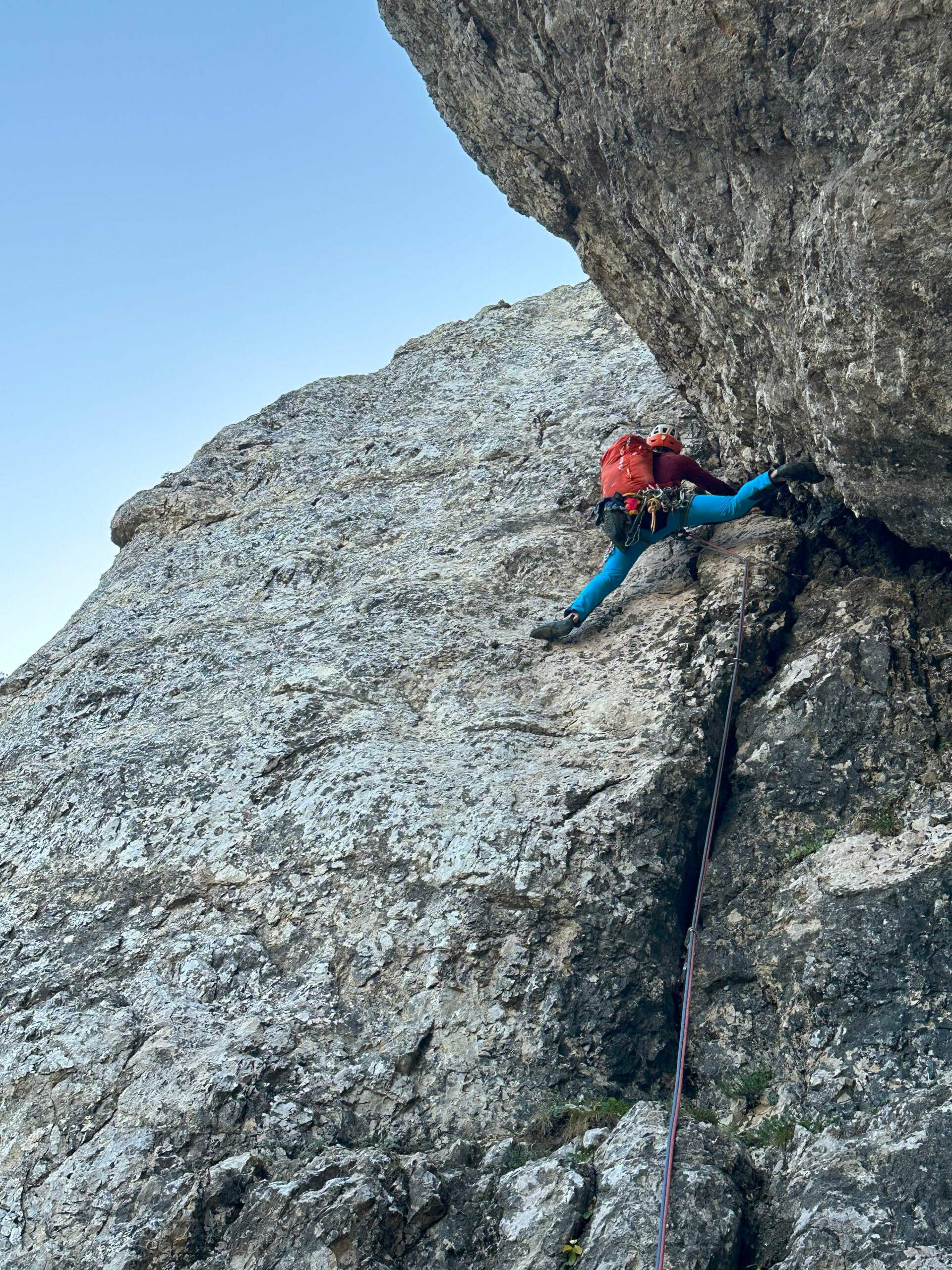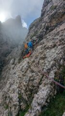 La via è prettamente alpinistica ma ben protetta; le protezioni sono clessidre e chiodi, fix utilizzati solo nei punti di sosta e su L7 .…