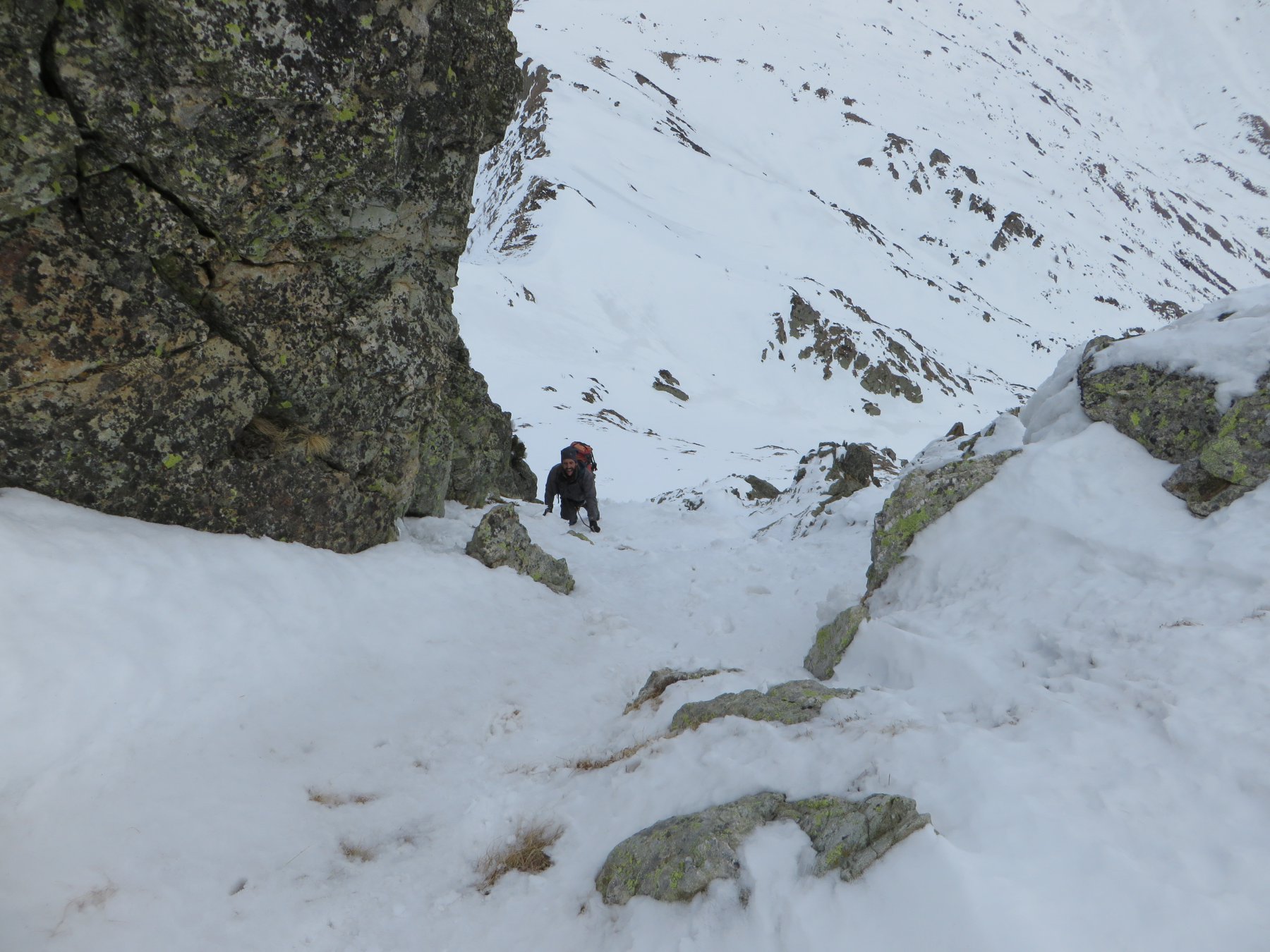 Canale in condizioni ottime, salito spesso in punta di ramponi. Discesa facile ,con due corde da 60 due doppie e si è sul nevaio sottostante…