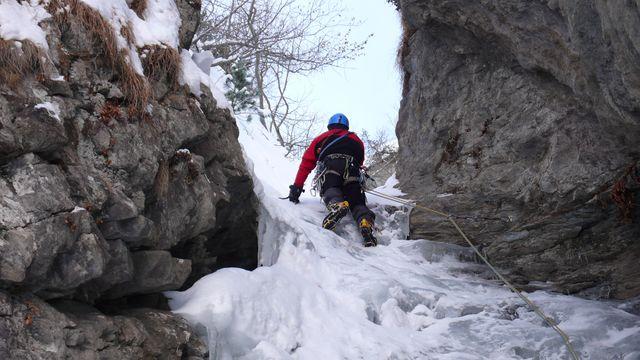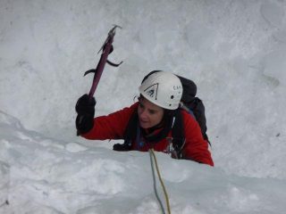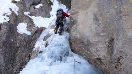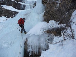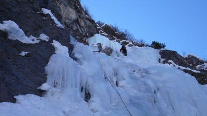 Dal parcheggio che si trova a circa 1 km da Freissinieres parte un sentiero battuto che porta alla base della colata. Primo tiro con ghiaccio…