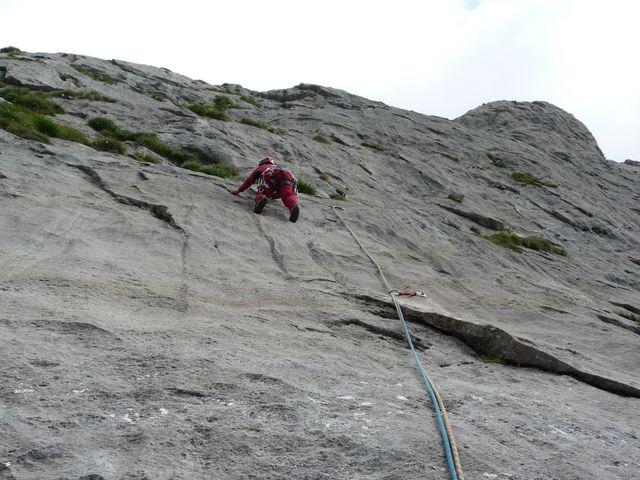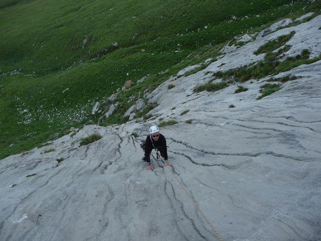 Il primo tiro è una scalinata, assente sotto la prima sosta. Il secondo e terzo tiro ben formati. Abbiamo proseguito ancora per due tiri su…