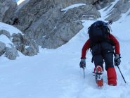 Giornata con vento molto forte, alcune cordate già nell'anfiteatro. Goulotte molto ridotta alla partenza. in alto vento che alzava neve. Scesi in doppia lungo l'itinerario…