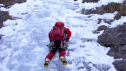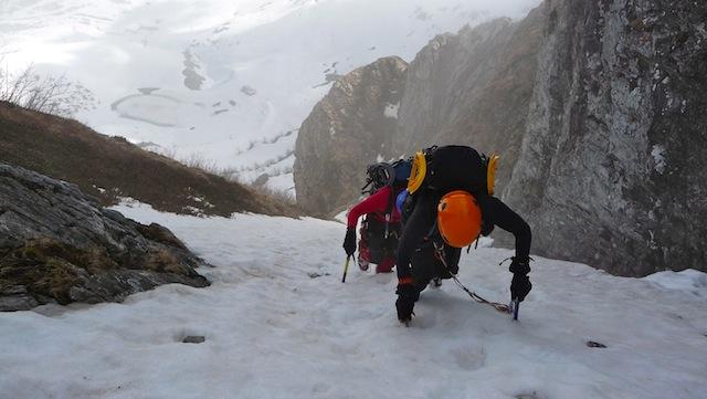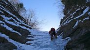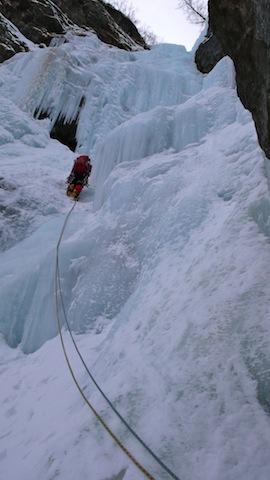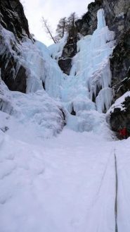 Salita dopo Valeria, primo tiro corto, e scalinato, poi lungo tratto su neve sino alla sosta. secondo tiro su ghiaccio duro, la colata presenta…