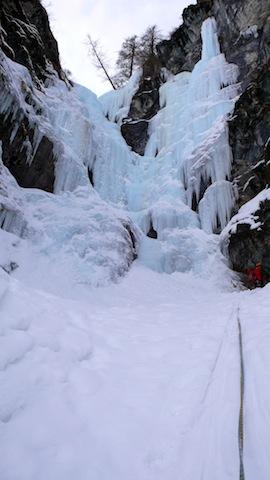 cascata formata, molta neve nel canale di raccordo per l'ultimo tiro, sentiero di discesa ben tracciato ma con neve non trasfomata