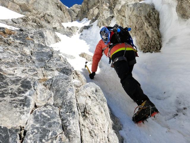 La neve inizia poco sopra il rifugio, poco rigelo ma nel complesso neve buona per i ramponi. Preso una via diretta per arrivare alla base…