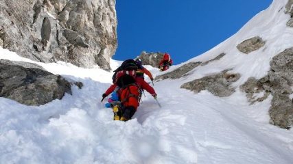 Partiti alle 4.30 da quota 4530 con un leggeo vento, risalita lentamente la pietraia giungiamo in cima pima di mezzogiorno, con un vento molto forte…