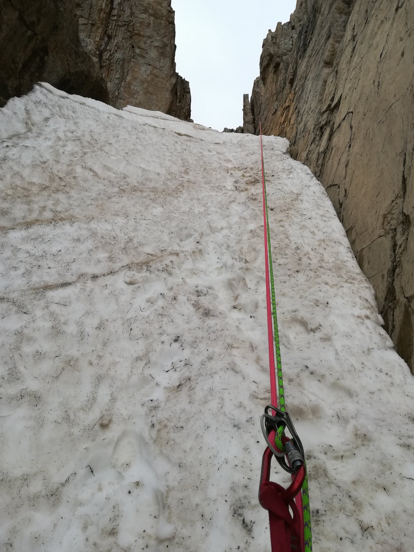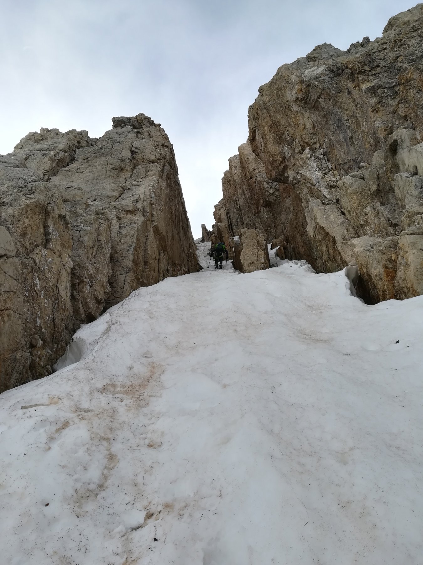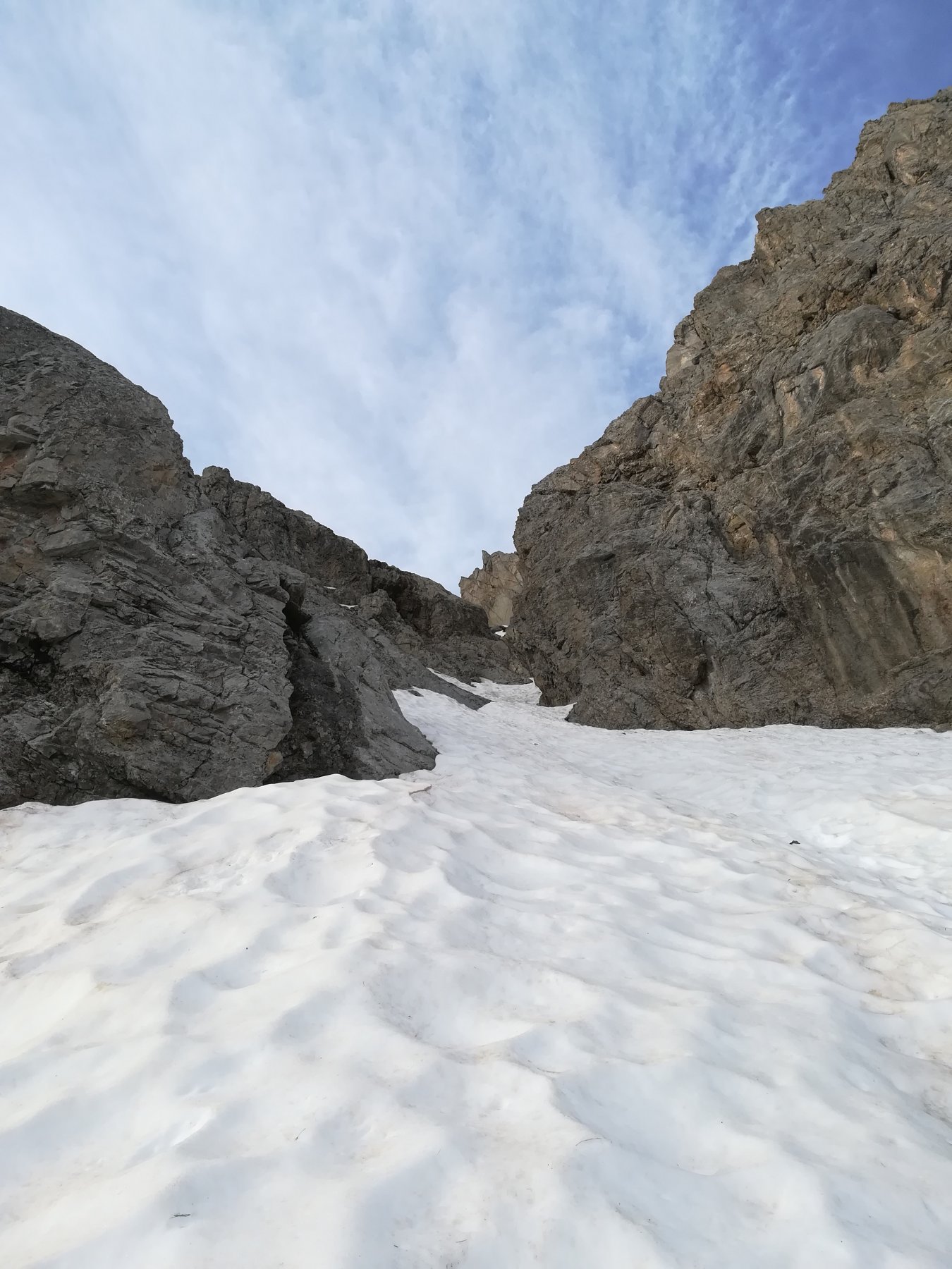 Saliti a piedi dal Pas Pordoi, un ora e tre quarti per arrivare alla forcella, all'uscita del canale c'è ancora un tratto innevato con corda…