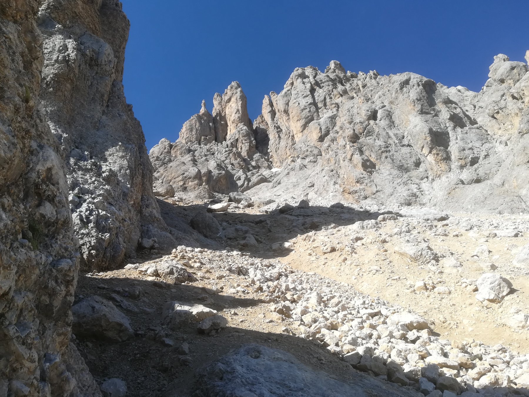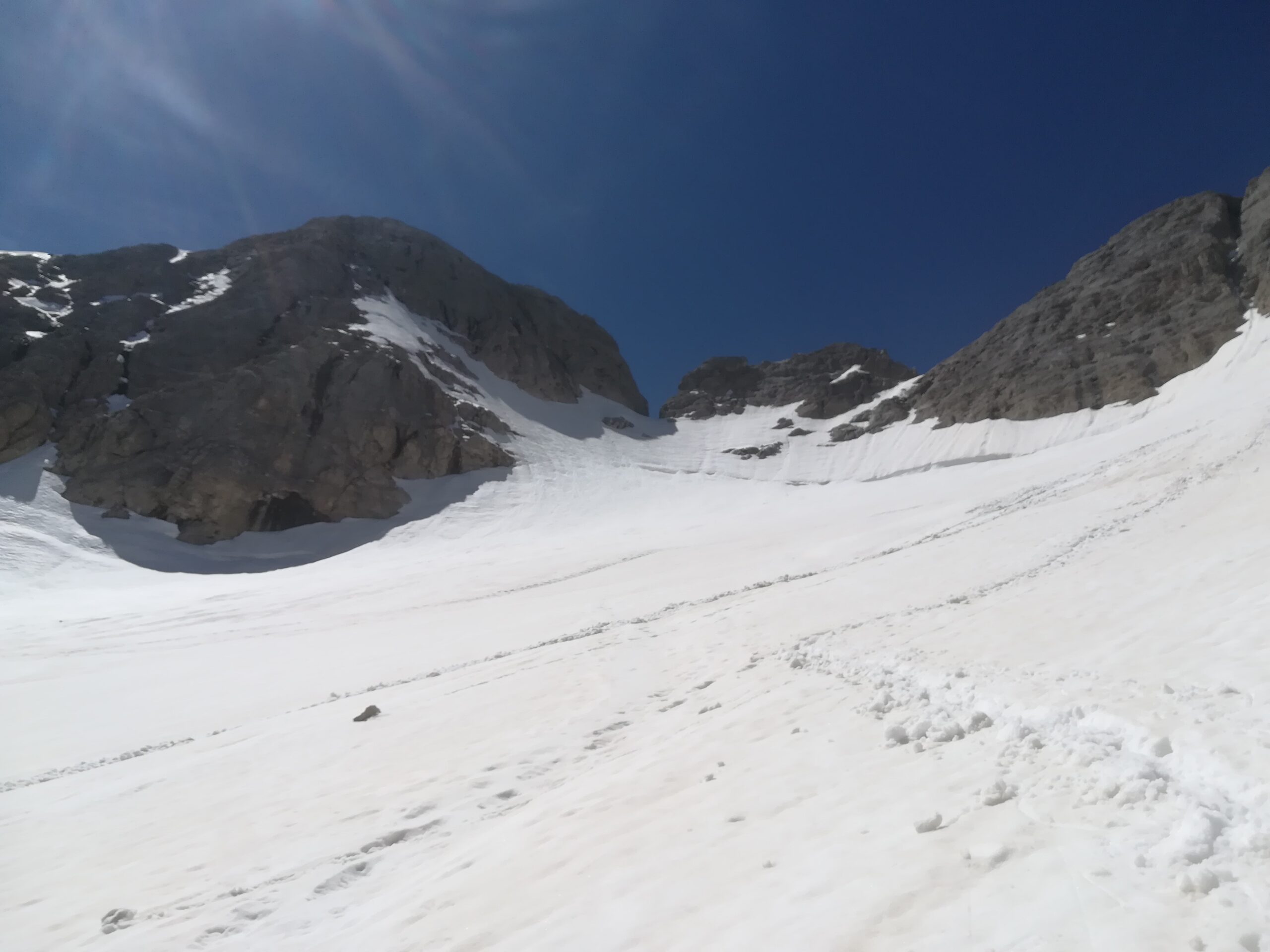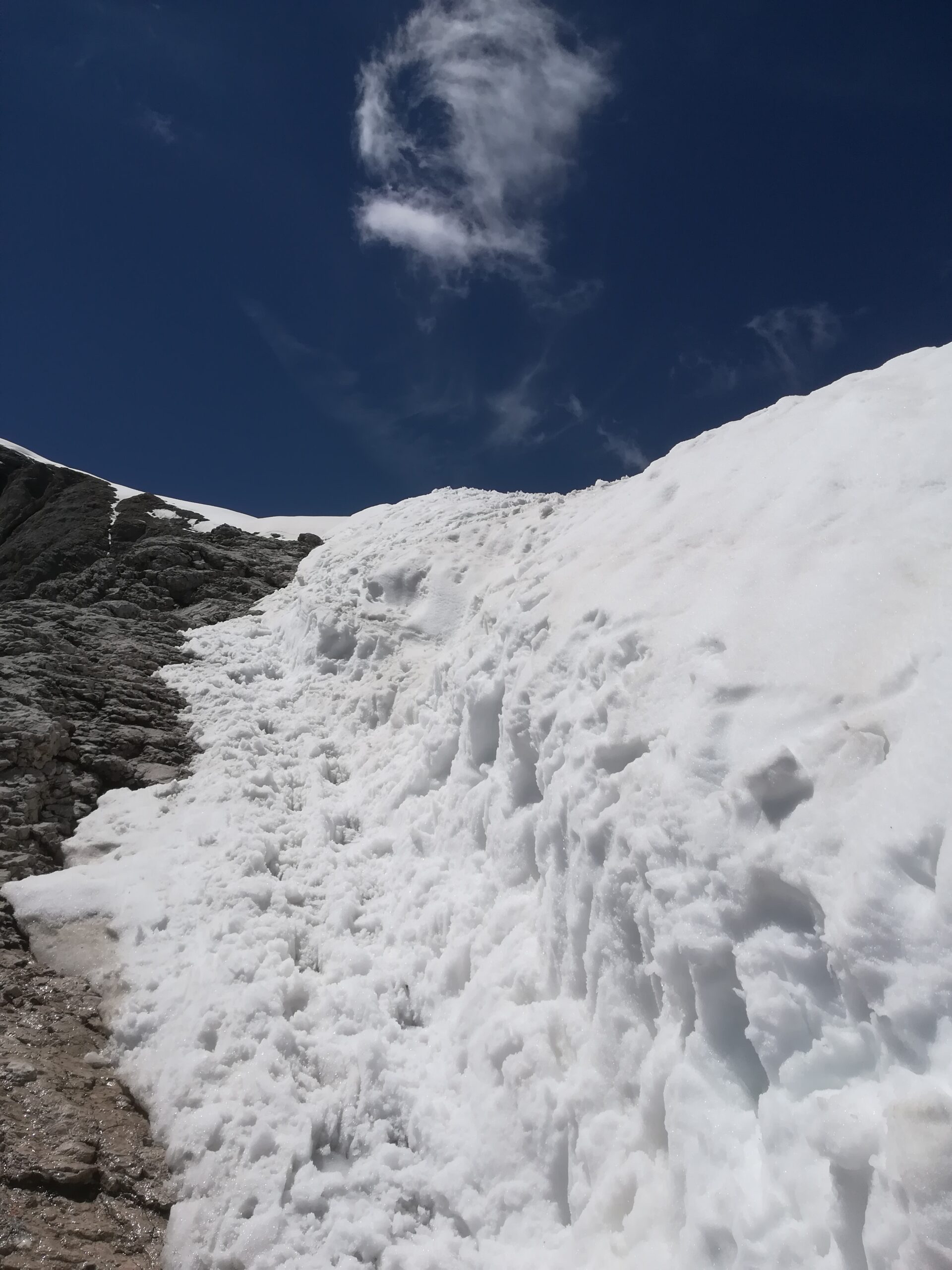 Saliti a piedi dal Pas Pordoi, un ora e tre quarti per arrivare alla forcella, all'uscita del canale c'è ancora un tratto innevato con corda…