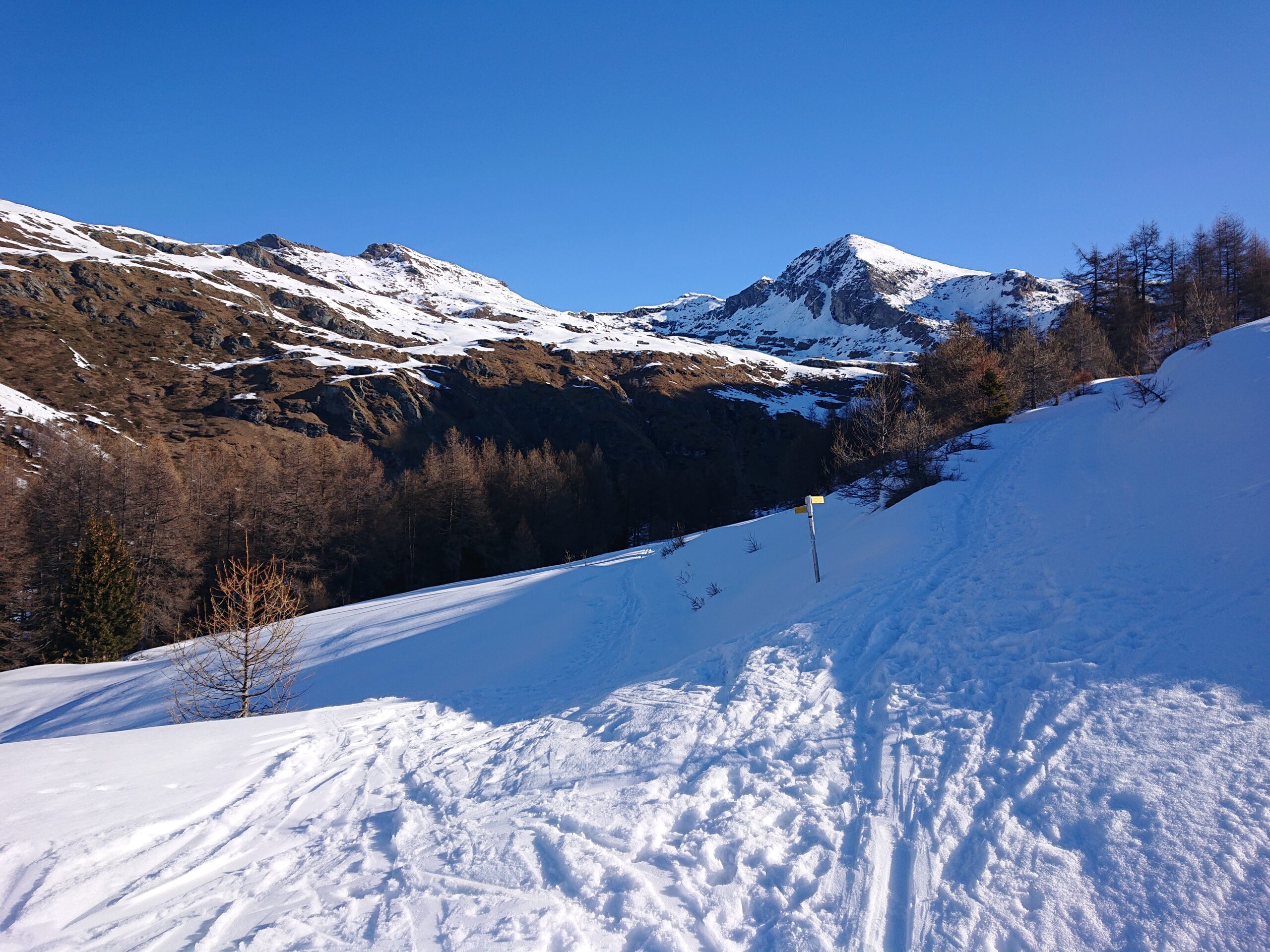 Partenza sci ai piedi, poca residua neve sulla mulattiera nei primi 100 mt, poi aumenta ma seguito il sentiero estivo fino a sopra Jatzil perché…