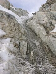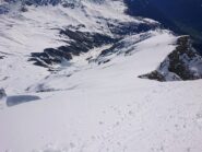 Discesa sul Ghiacciaio del Trayo lungo catene e tratti verticali, ghiacciaio con diverse zone crepacciate evitabili, a monte dell'isola rocciosa centrale e a monte della…