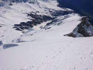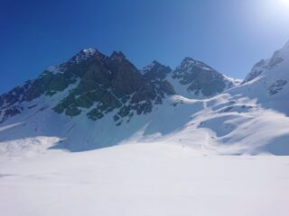 Neve presente solo dal Rifugio Pizzini, da qui passato sul lato di sinistra su neve spianata dura e portate fino al canale di accesso alla…