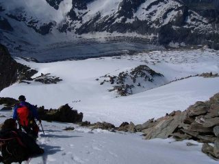 Agli alpeggi Leuchey proseguire come indicato dallo schema sulla cartina.Arrivati all'altezza dei paravalanghe ,se in presenza di neve dura camminabile, consigliamo di salire immediatamente…