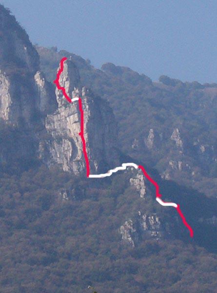 | mariolone | Lo sviluppo della via.In colore chiaro i pezzi di ferrata, camminata.In rosso le parti di arrampicata