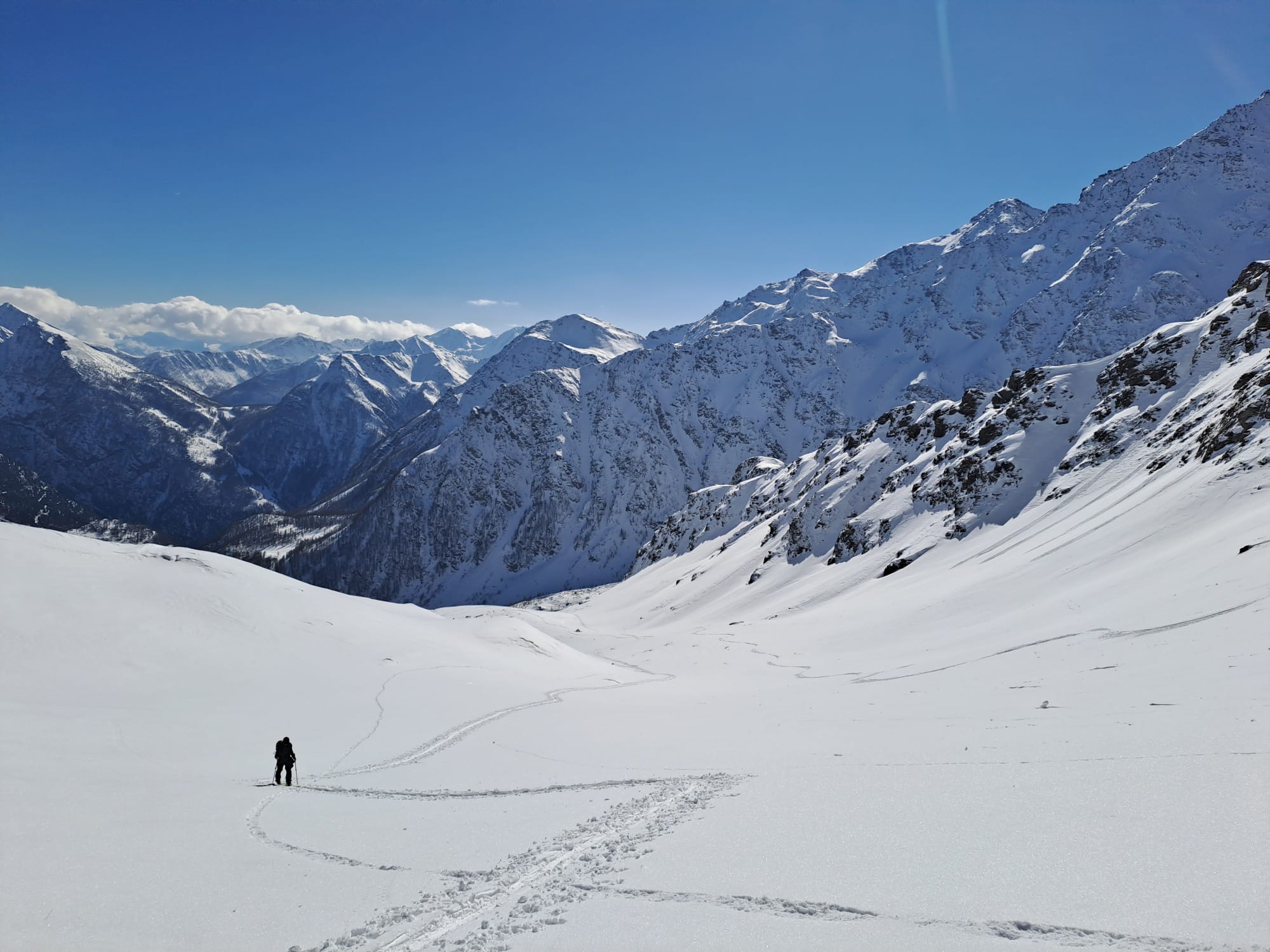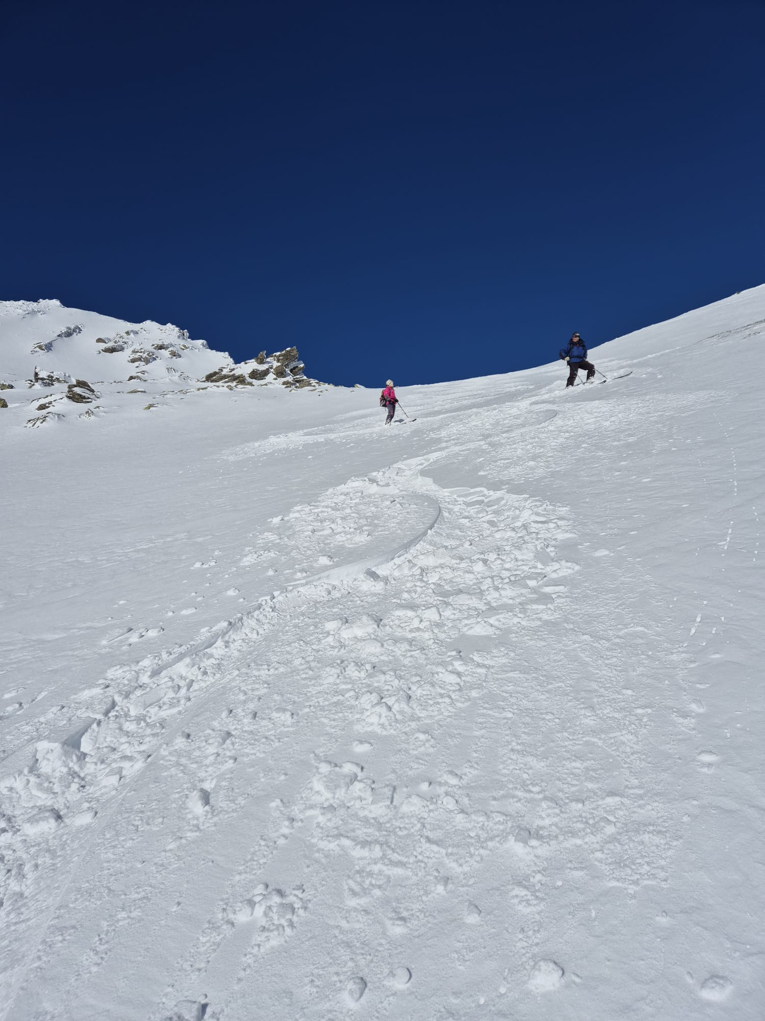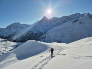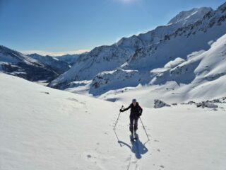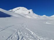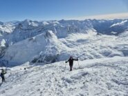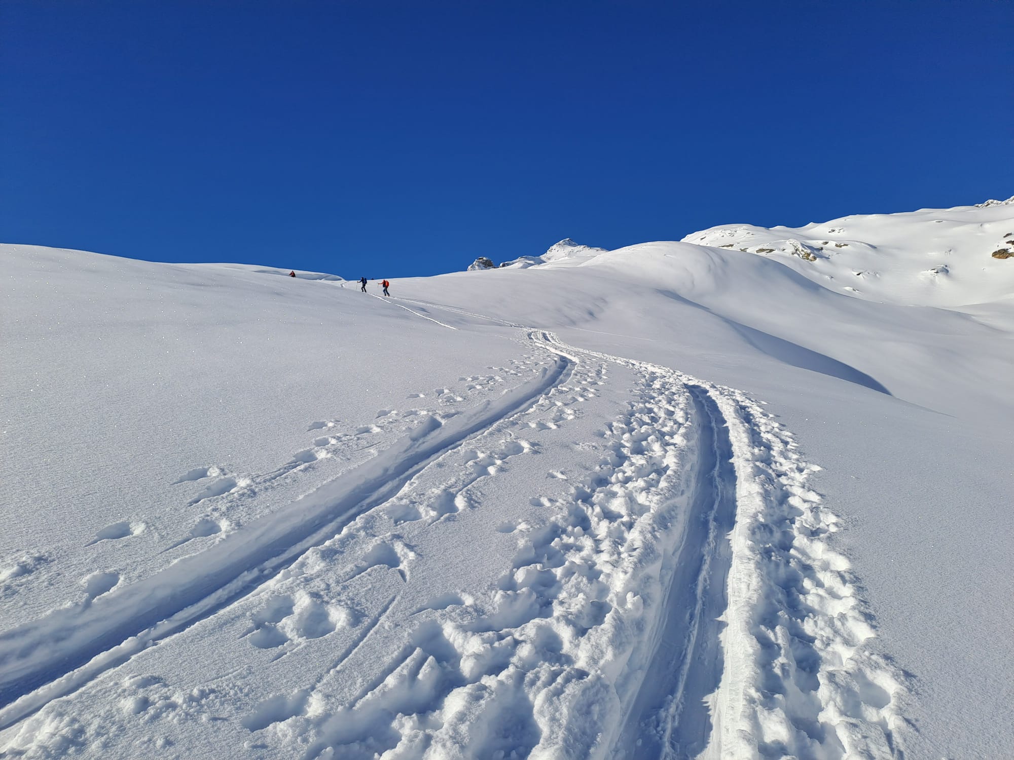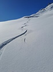 Bellissima gita in neve farinosa splendida, molta gente sul percorso ma gli ambi pendii e valletti hanno consentito di trovare neve intonsa. In basso ultimissimo…