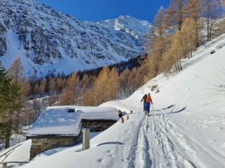 Primo pezzo nel bosco con poca neve e in salita si ravana parecchio, meglio prendere il sentiero/stradina sulla destra. Da fine bosco la traccia andava…
