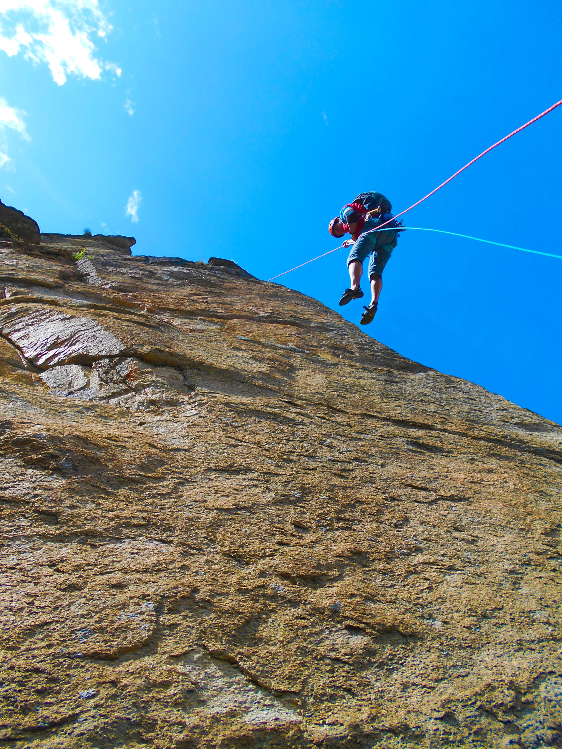 | mauriziodallachiesa | Ultima doppia sulla bastionata bassa prima di toccare terra.. | mauriziodallachiesa | 180 mt. nel vuoto.. La prima delle 3 doppie da 60 mt. sulla bastionata bassa per raggiungerne la base. La bastionata alta in cui viene effettuata la 1a doppia (anch'essa da 60 mt. esatti) è separata dalla bastionata bassa da una grande cengia erbosa. Per proseguire con la seconda parte della discesa, bisogna raggiungere a piedi (avvalendosi di una corda fissa) la sosta 7 di -Sole d'Autunno- e/o sosta 9 di -il Volo del Gipeto- posizionata al disotto di una pianta sradicata appoggiata ad un roccione.. | mauriziodallachiesa | | mauriziodallachiesa | Tiro finale da fantascienza!!