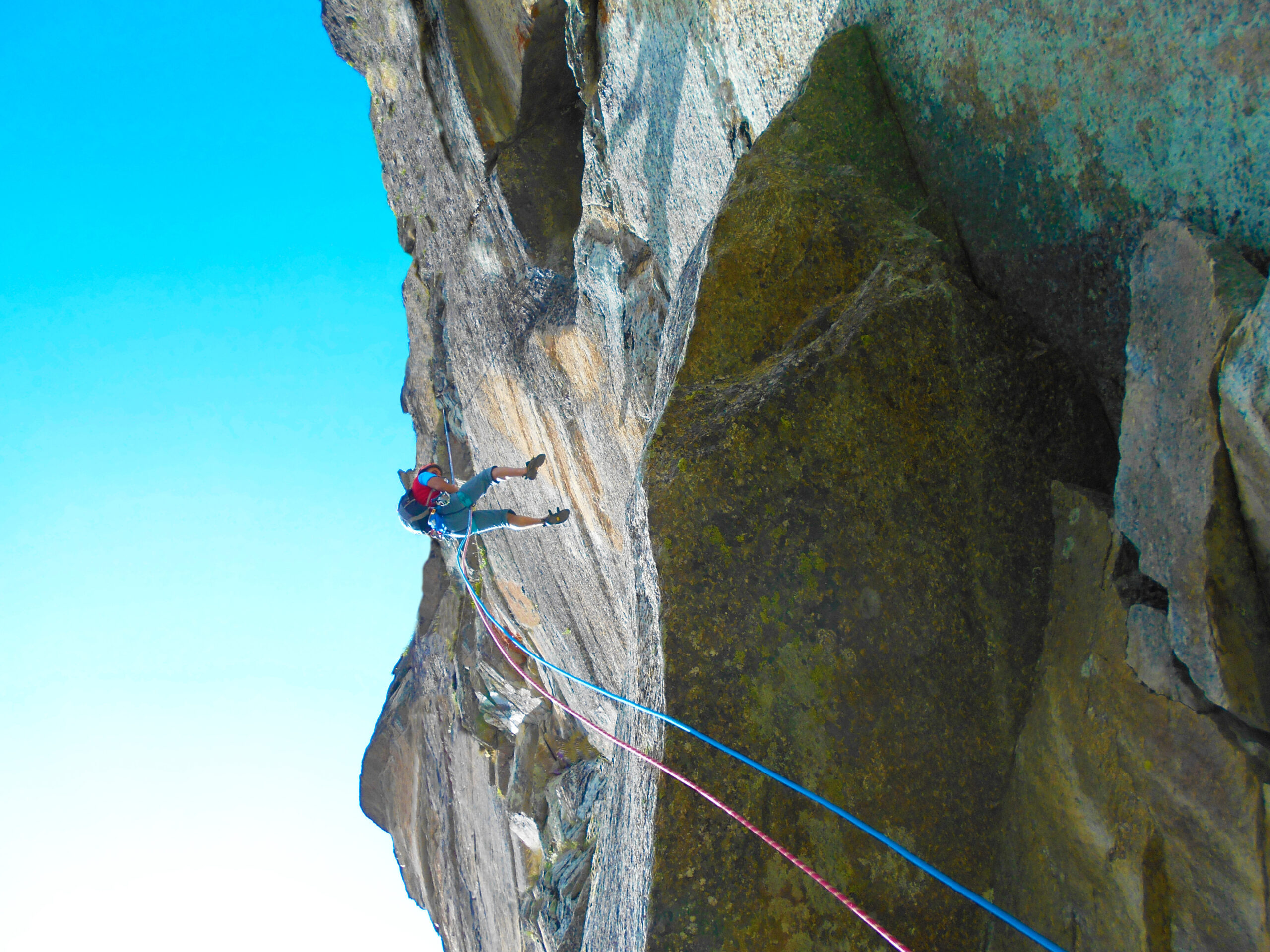 3 doppie da 60 mt. esatti nel vuoto totale.. | mauriziodallachiesa | | mauriziodallachiesa | L4 nel tratto ancora arrampicabile di 6b. Il tratto successivo, da tutti superato in A0 (me compreso) a mio parere potrebbe trattarsi di un 7a quindi oltre la valutazione proposta ipotizzata (6c+) ma non ne sono certo.... | mauriziodallachiesa | Marco sta salendo il bel muro verticale a buchi (quasi fosse una roccia calcarea..) che porta alla cengia sotto la fascia strapiombante.