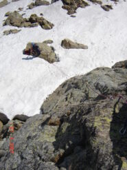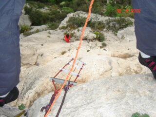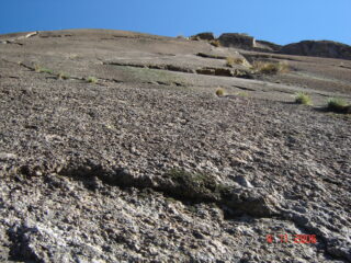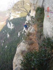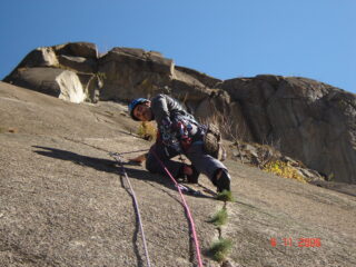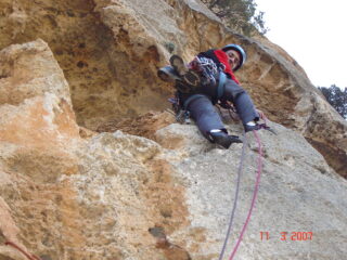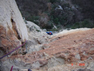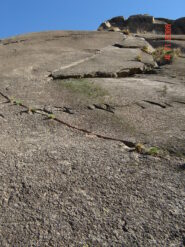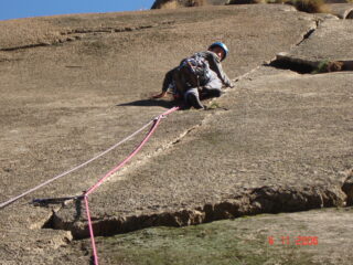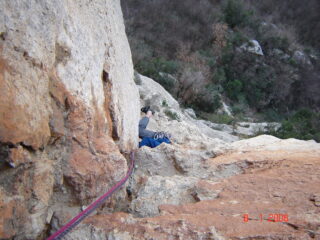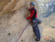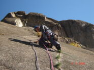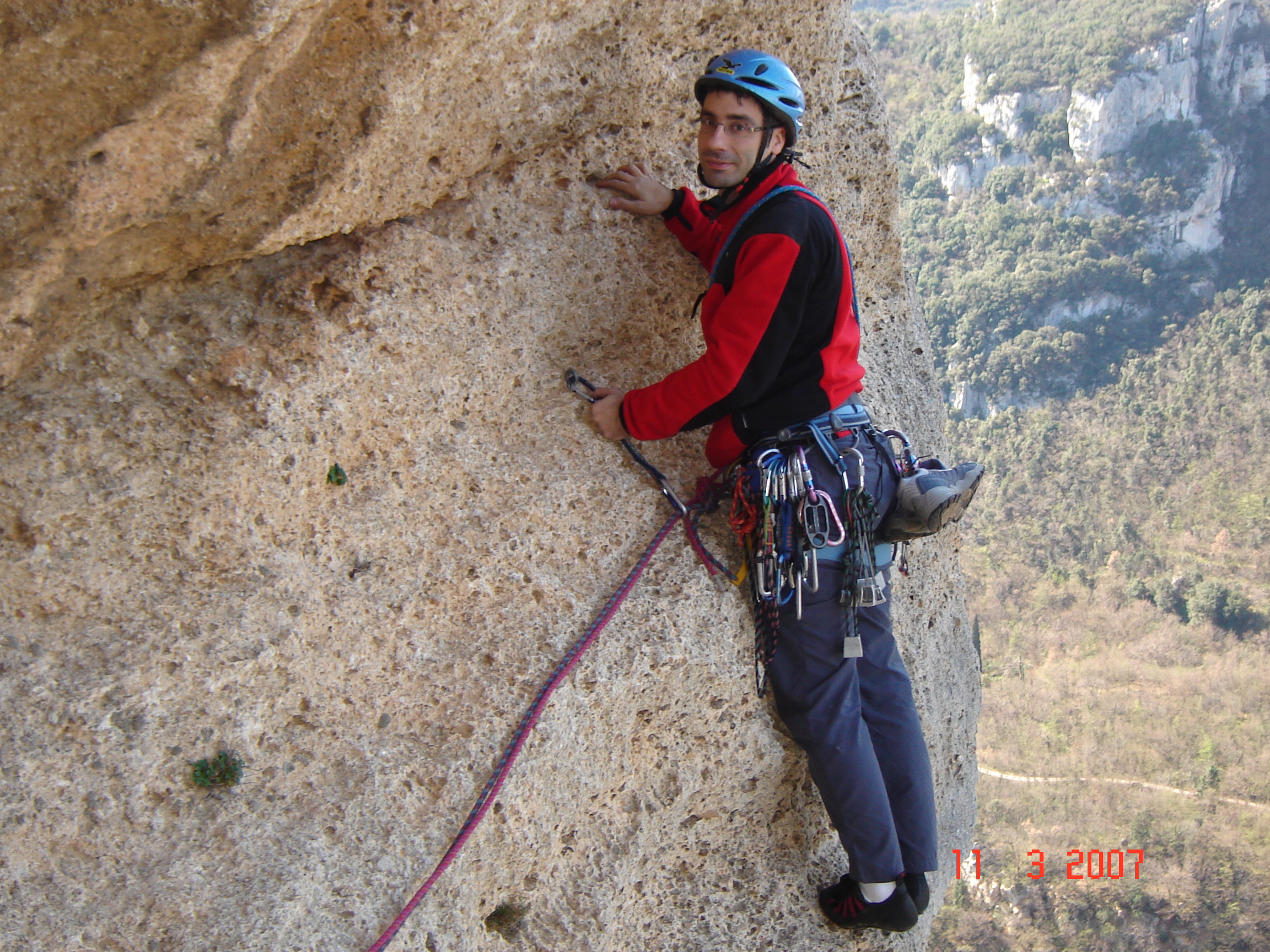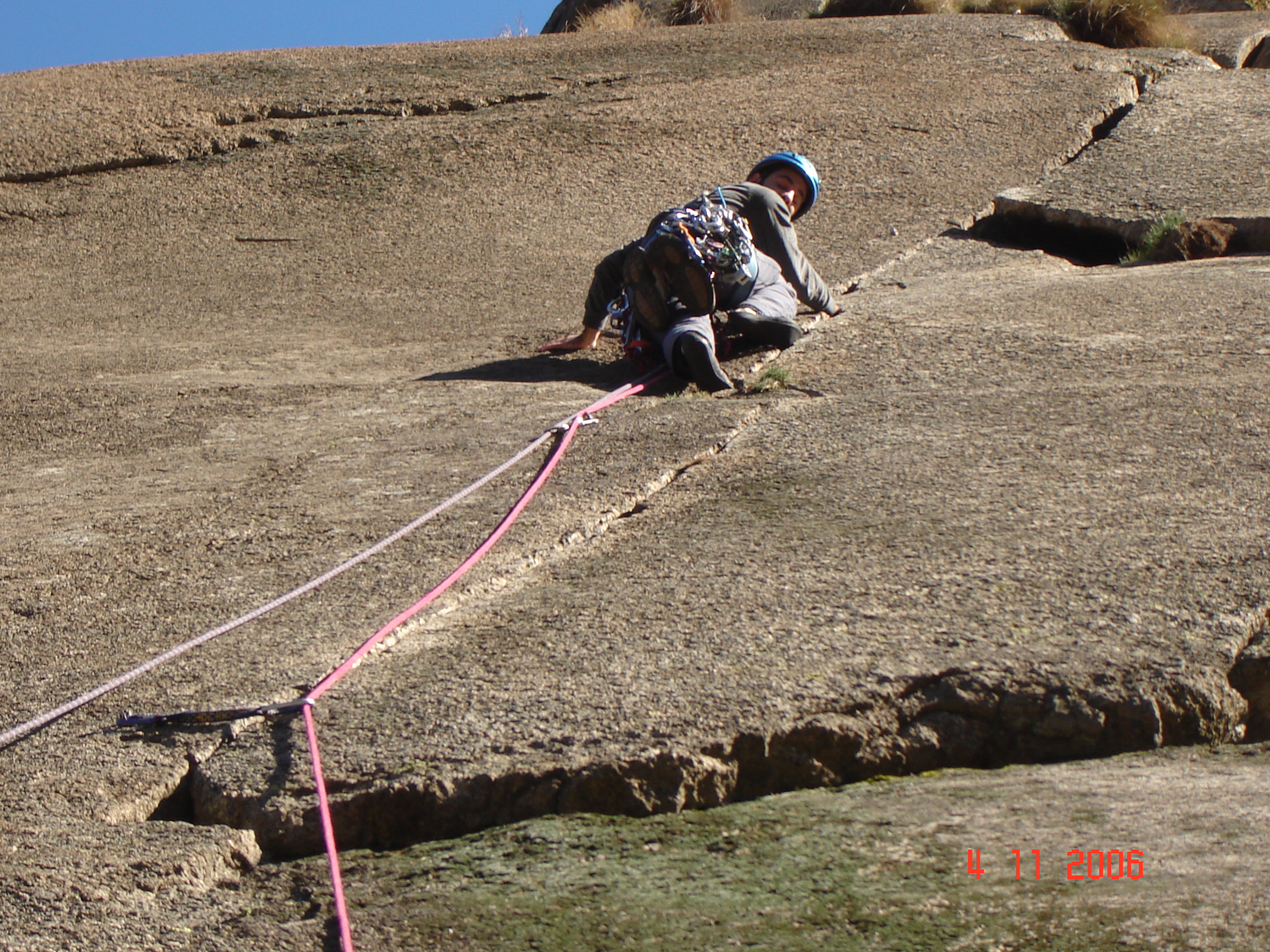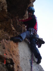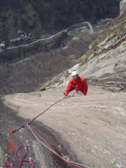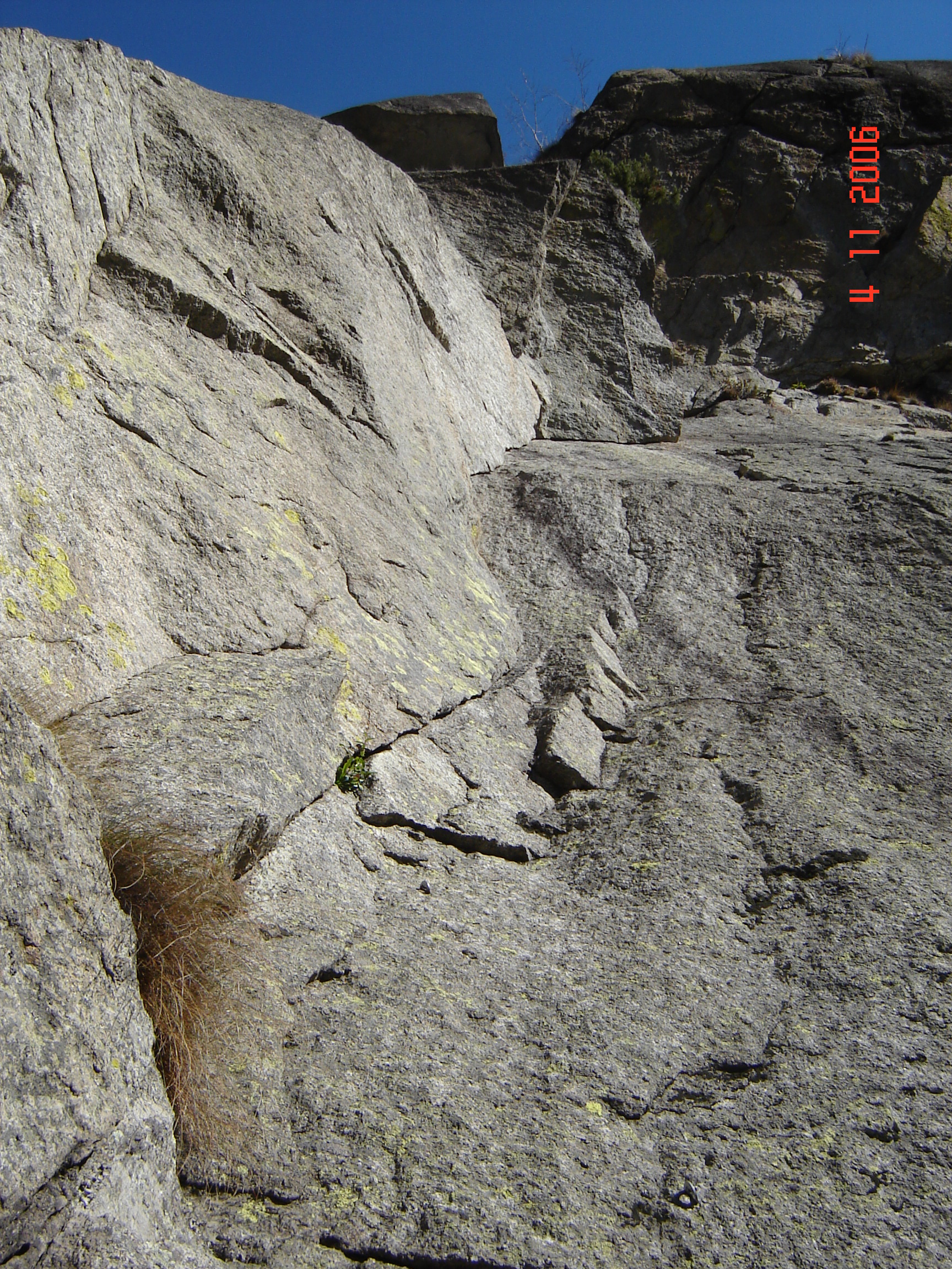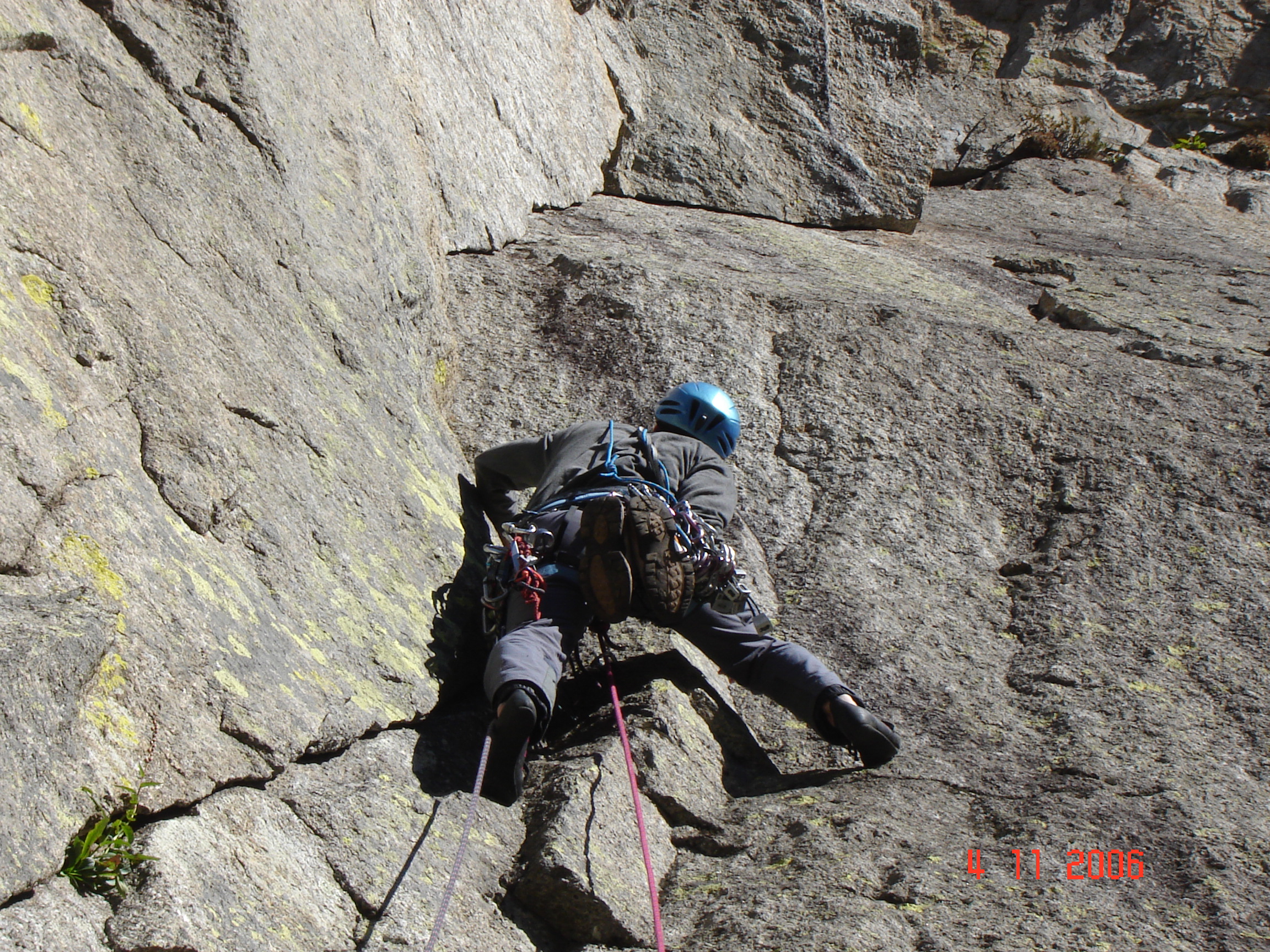 Primi 3 tiri in comune con la Via del Fratello. Arrampicata prevalentemente su placca e fessura ben protetta.