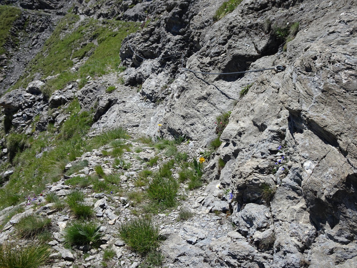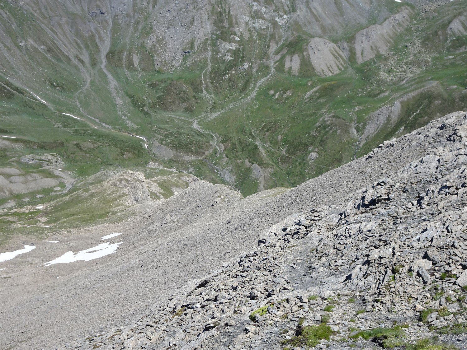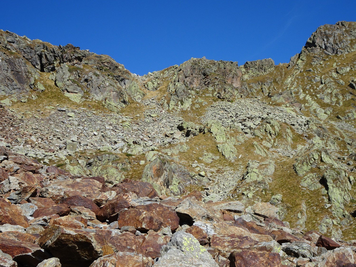 | max58 | Salendo | max58 | vista sull'itinerario di salita | max58 | sotto la vetta il tratto protetto da cavi | max58 | la pietraia della discesa dal basso