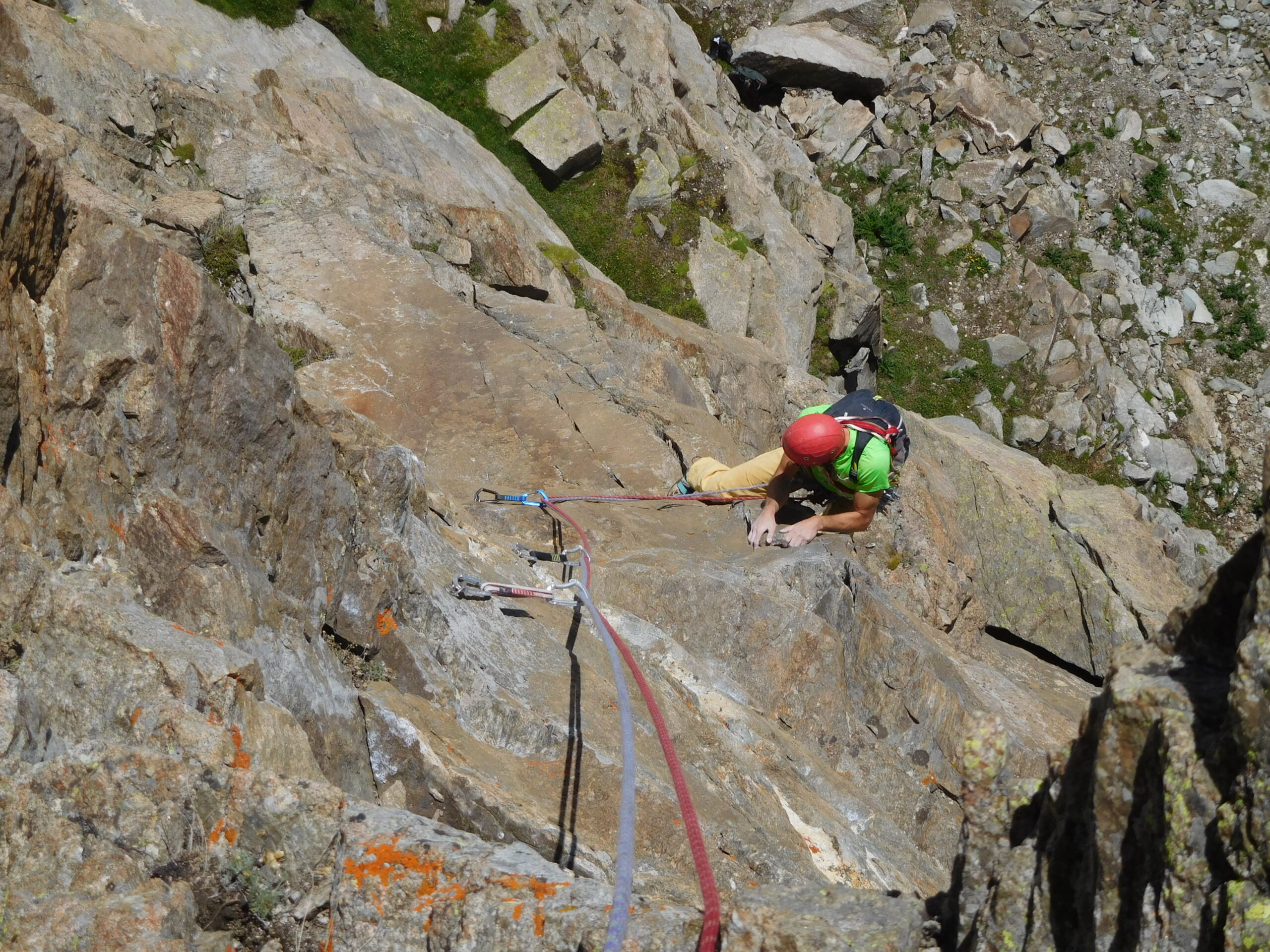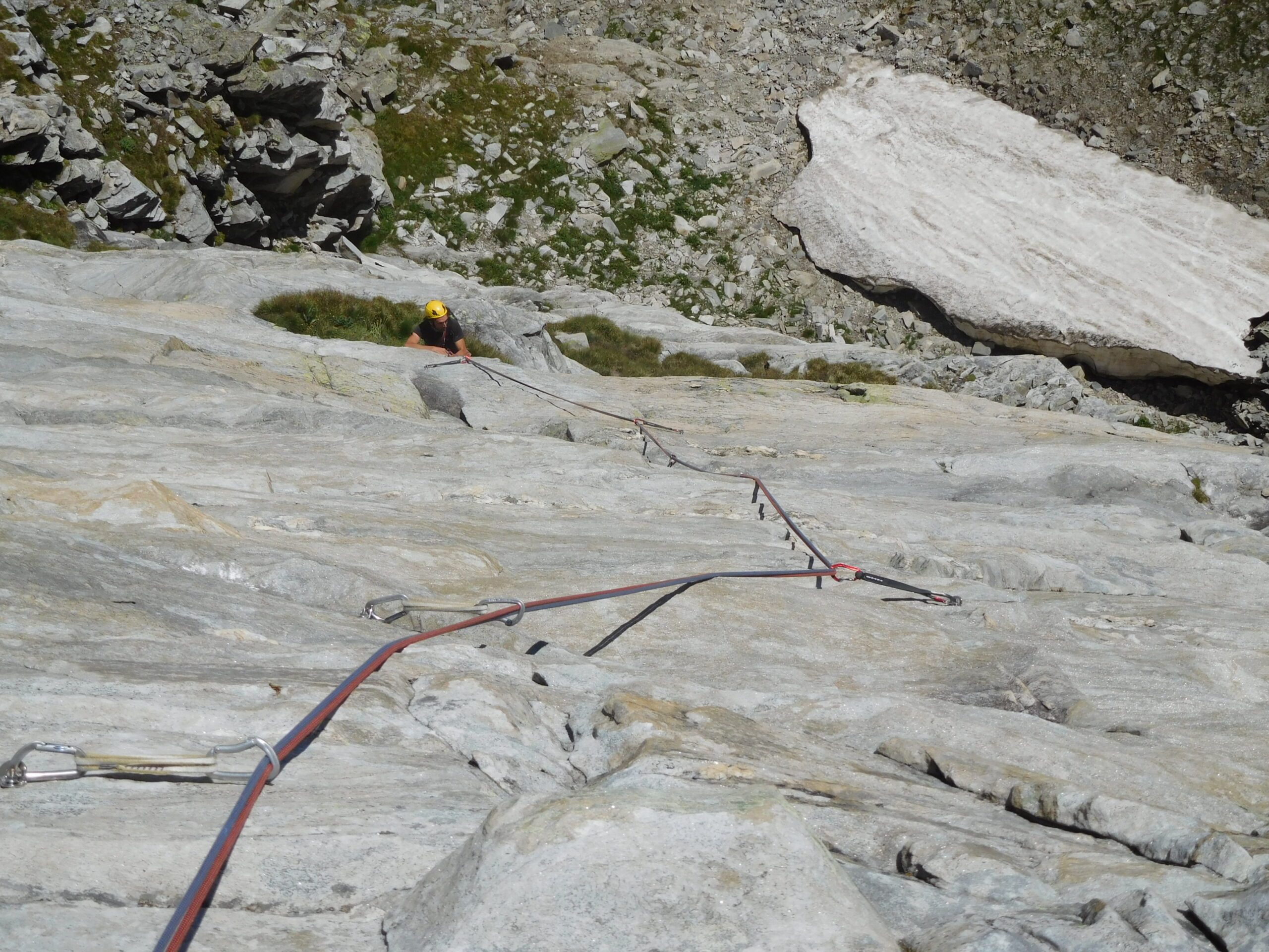 | mccandless | Il bel diedro fessurato da integrare di L1. | mccandless | L1, appena prima della sequenza da integrare col friend n. 0,5 (friend nascosto sotto al tettino). | mccandless | Gli ultimi metri della L1. | mccandless | La delicata parte finale di L2. | mccandless | Il bel muro della lunghezza finale.
