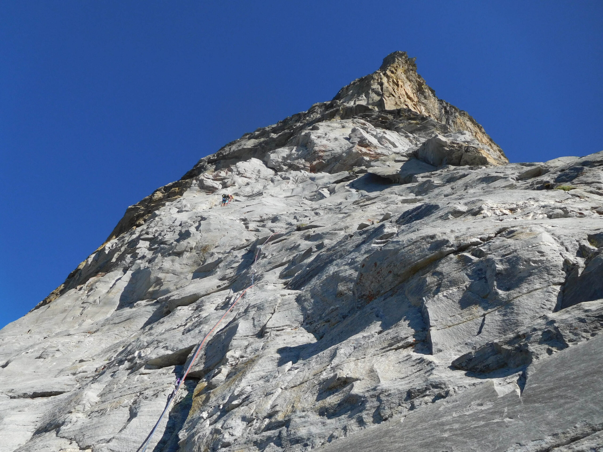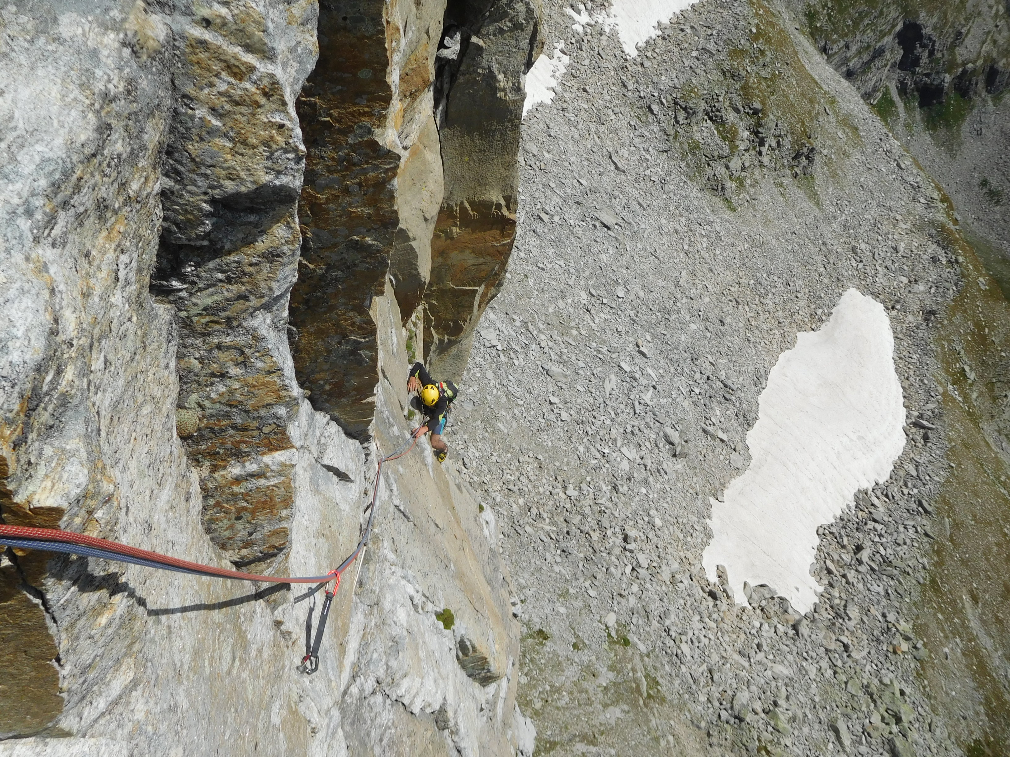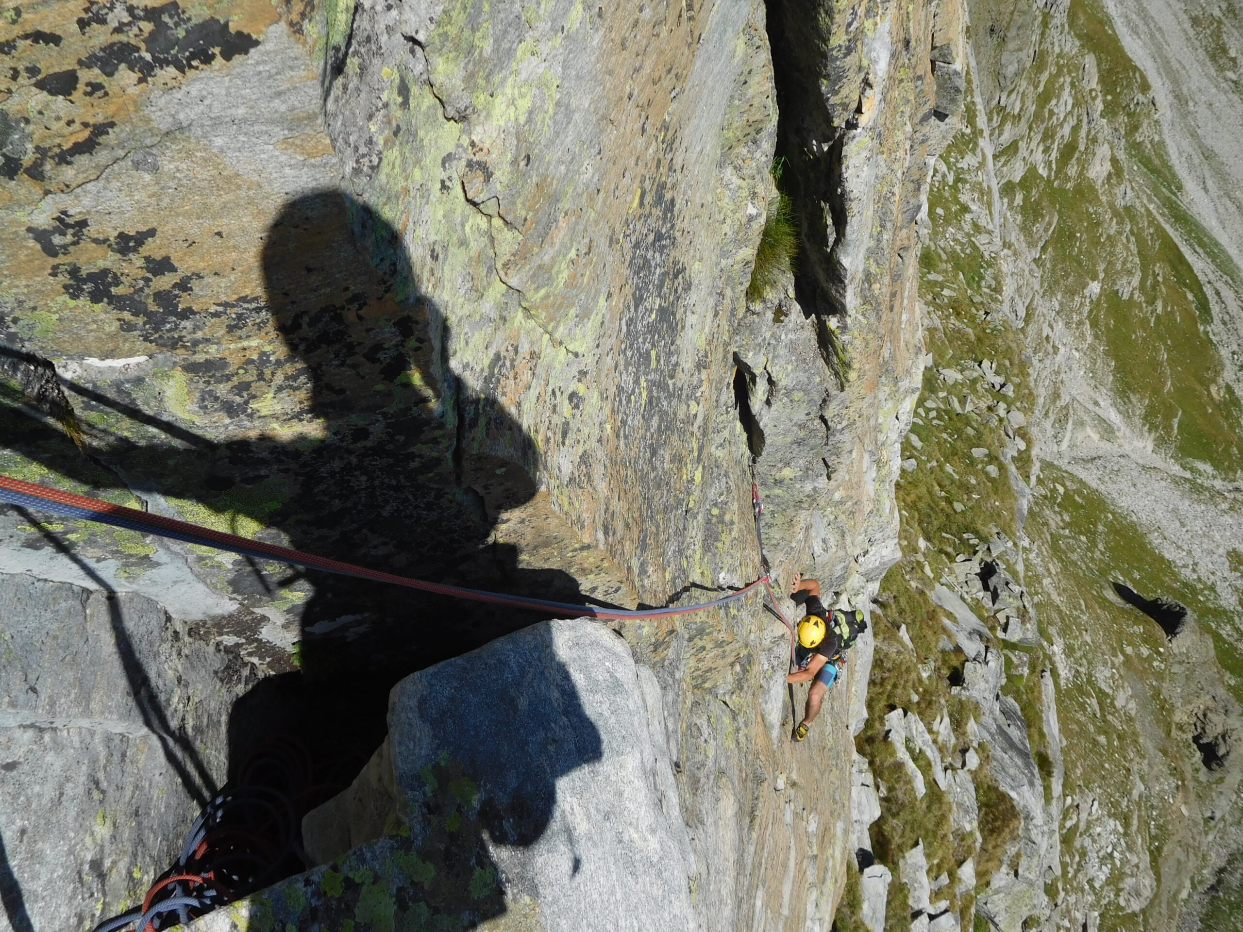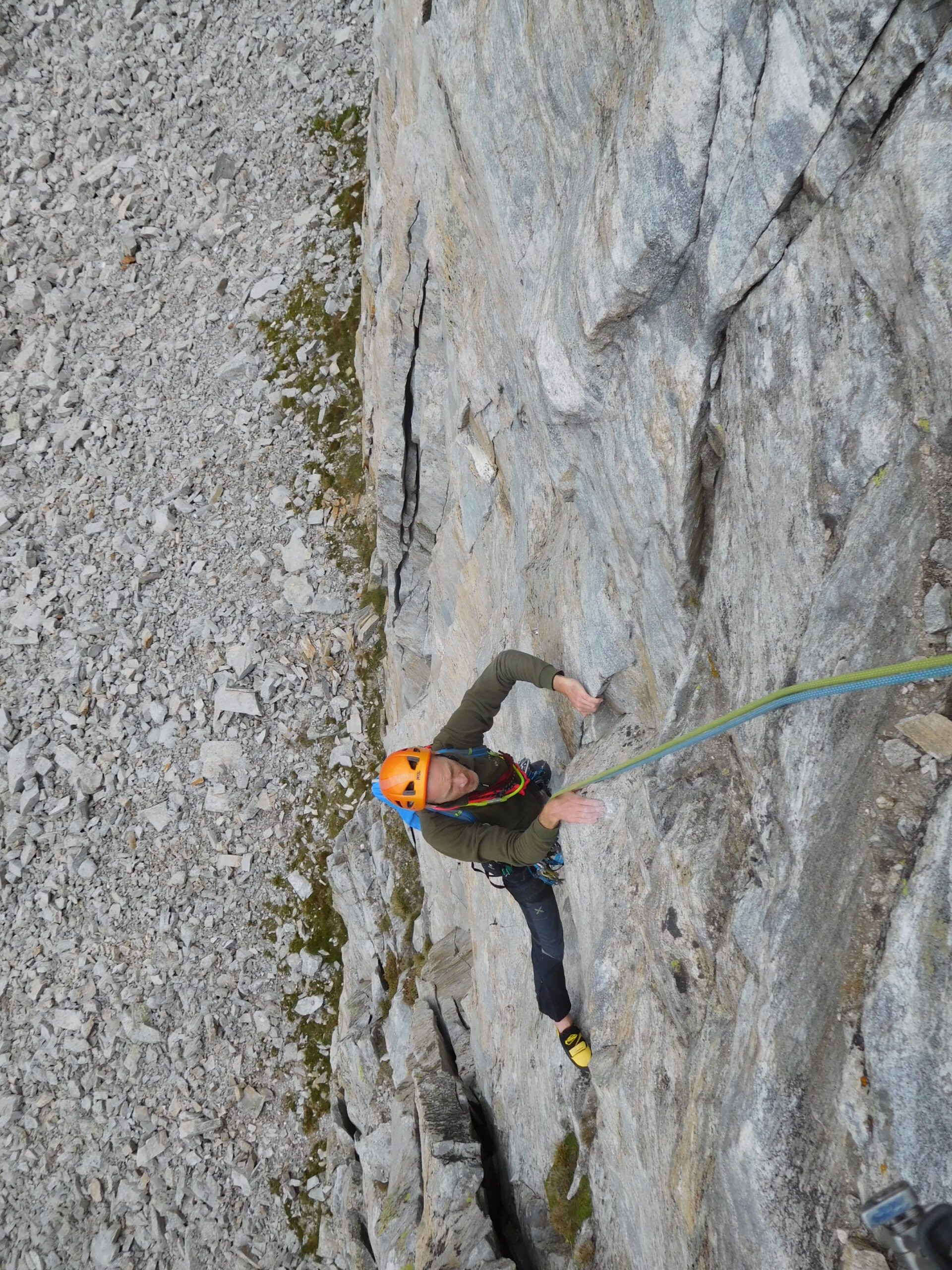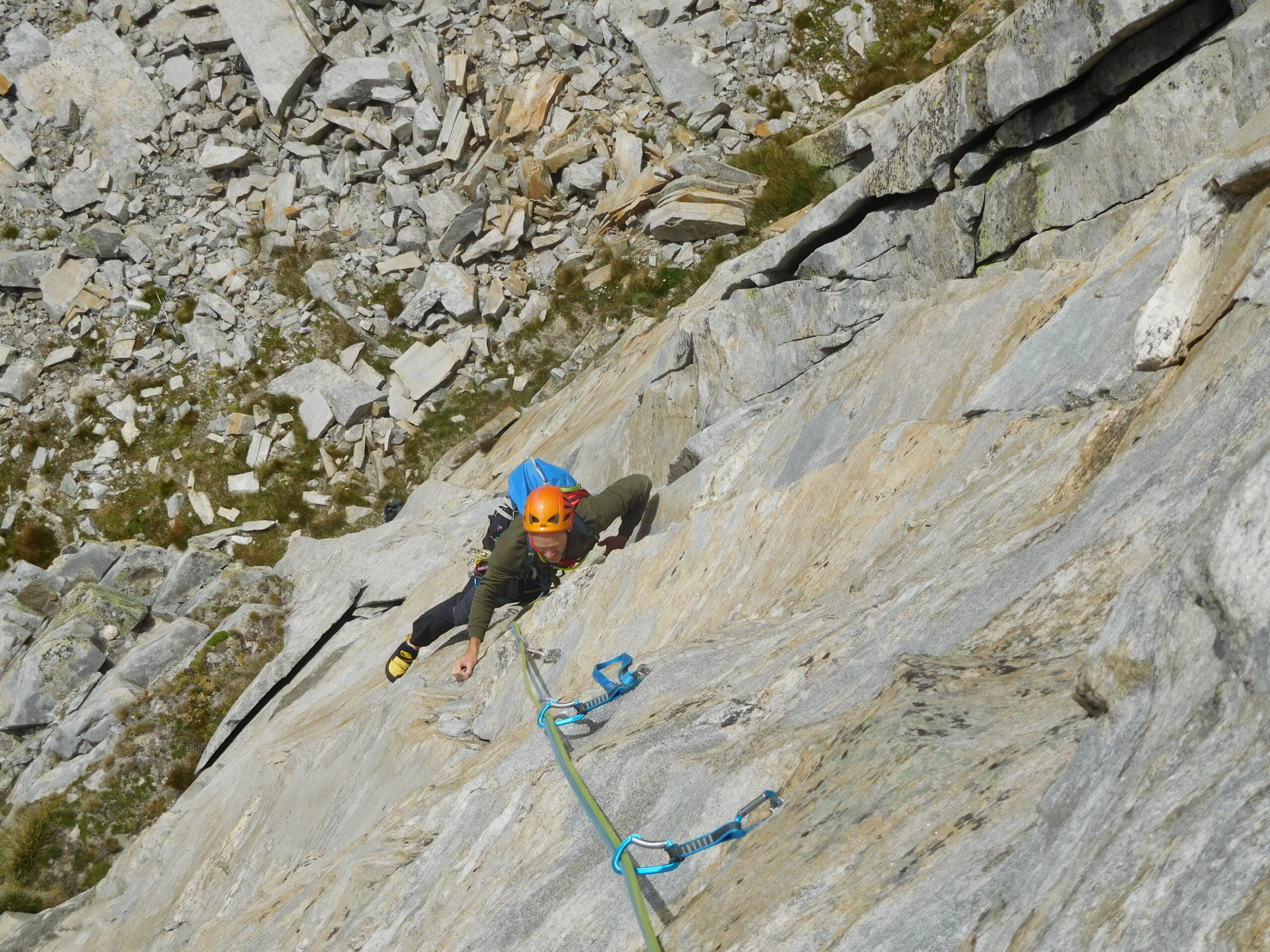 | mccandless | Gli ultimi metri della L3. | mccandless | L5, la prima lunghezza dopo lo zoccolo basale. | mccandless | L9, in corrispondenza della lama instabile.