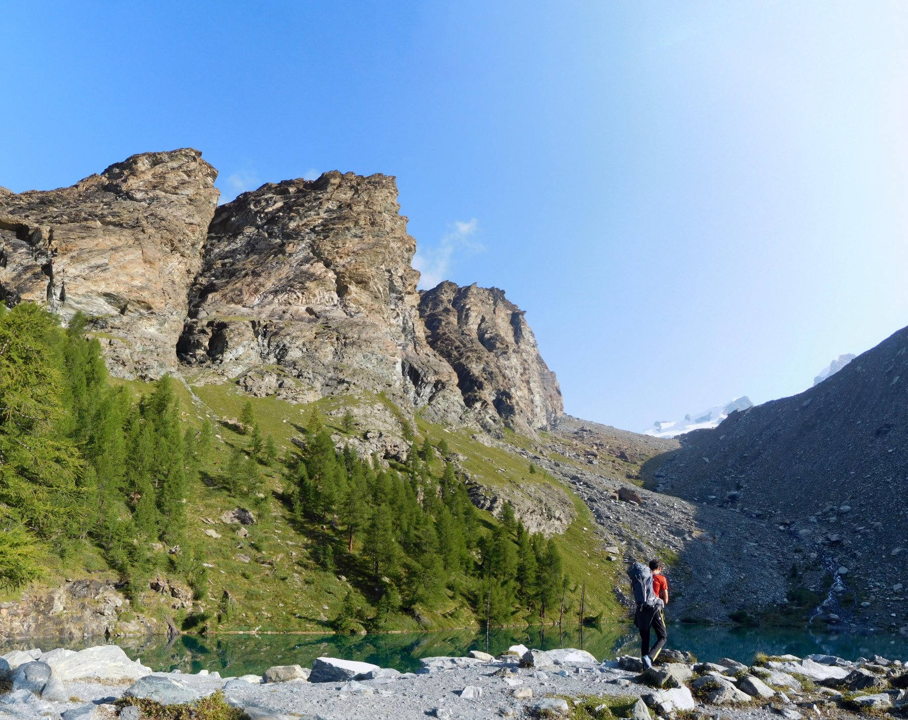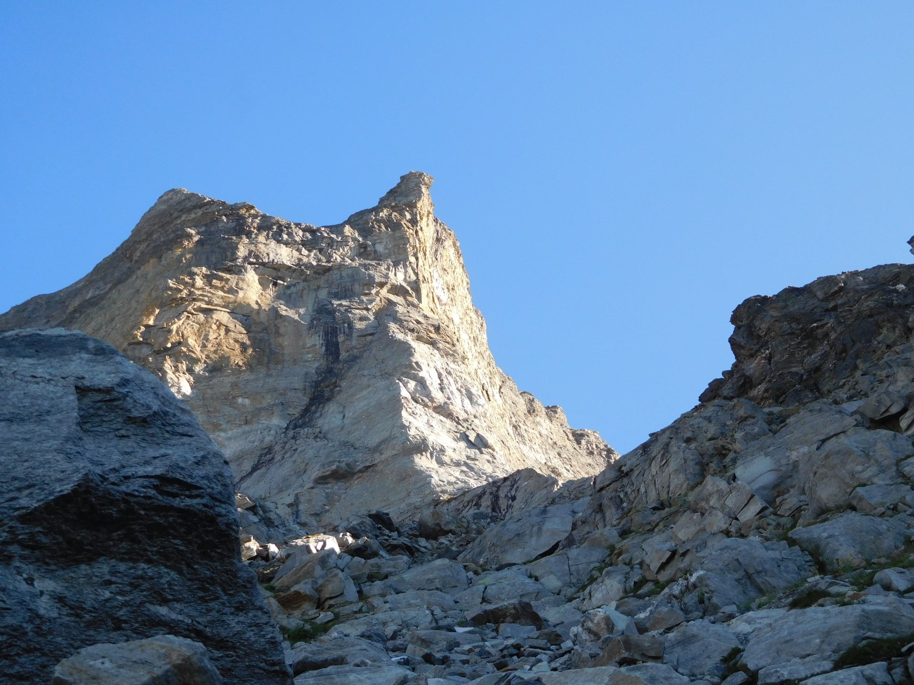 | mccandless | Il Lago Blu con la Rocca di Verra sullo sfondo. | mccandless | La morena da percorrere in fase di avvicinamento e la Rocca di Verra sulla Sx. | mccandless | Il traverso della L6. | mccandless | L'uscita non banale di L7.