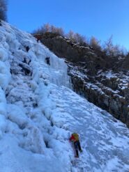 Come in tutta la zona il ghiaccio è scarso, anche se si sale facilmente. Neve lungo la colata per nevicata recente. Temperature rigide (-11°)