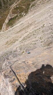 L'attacco è su una rampa di roccia chiara, lo spit in alto si vede appena. Nella prima parte les montagnard è molto vicina a sole…
